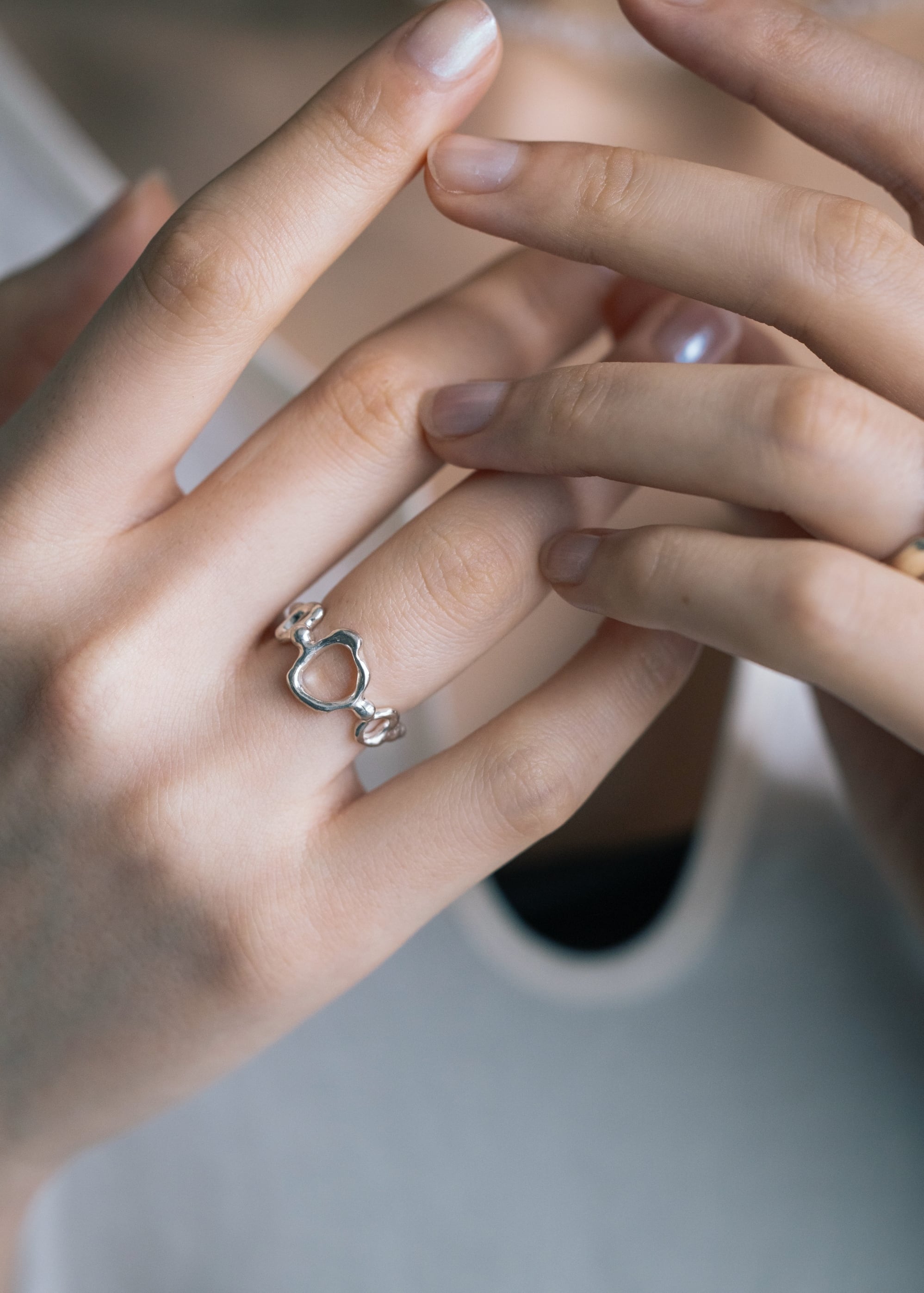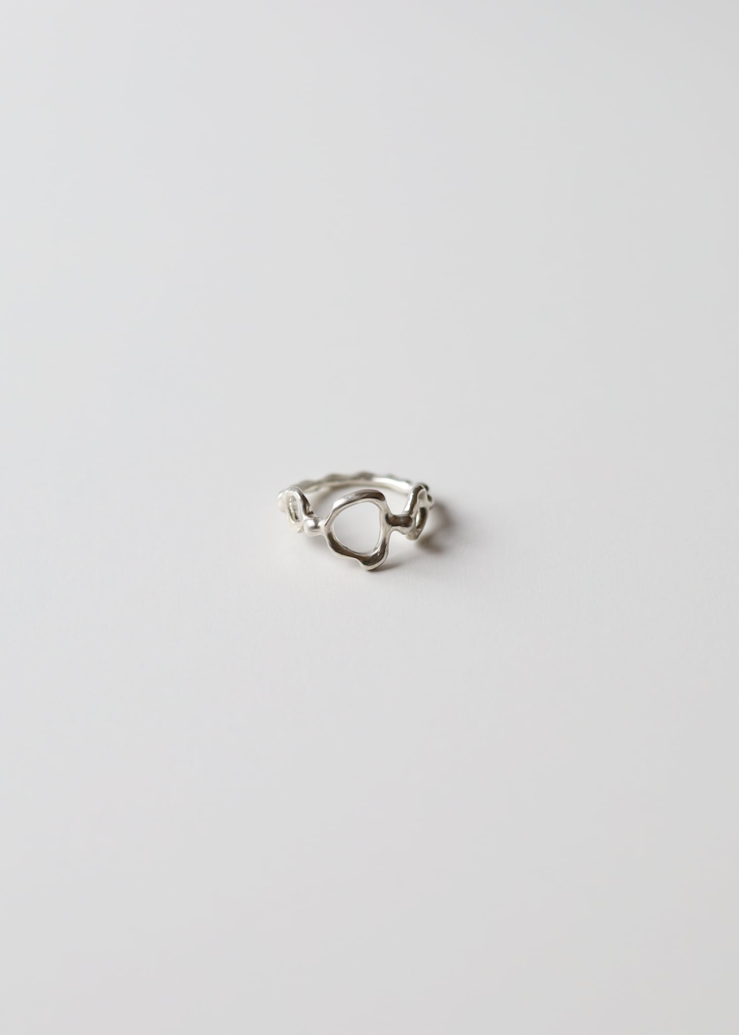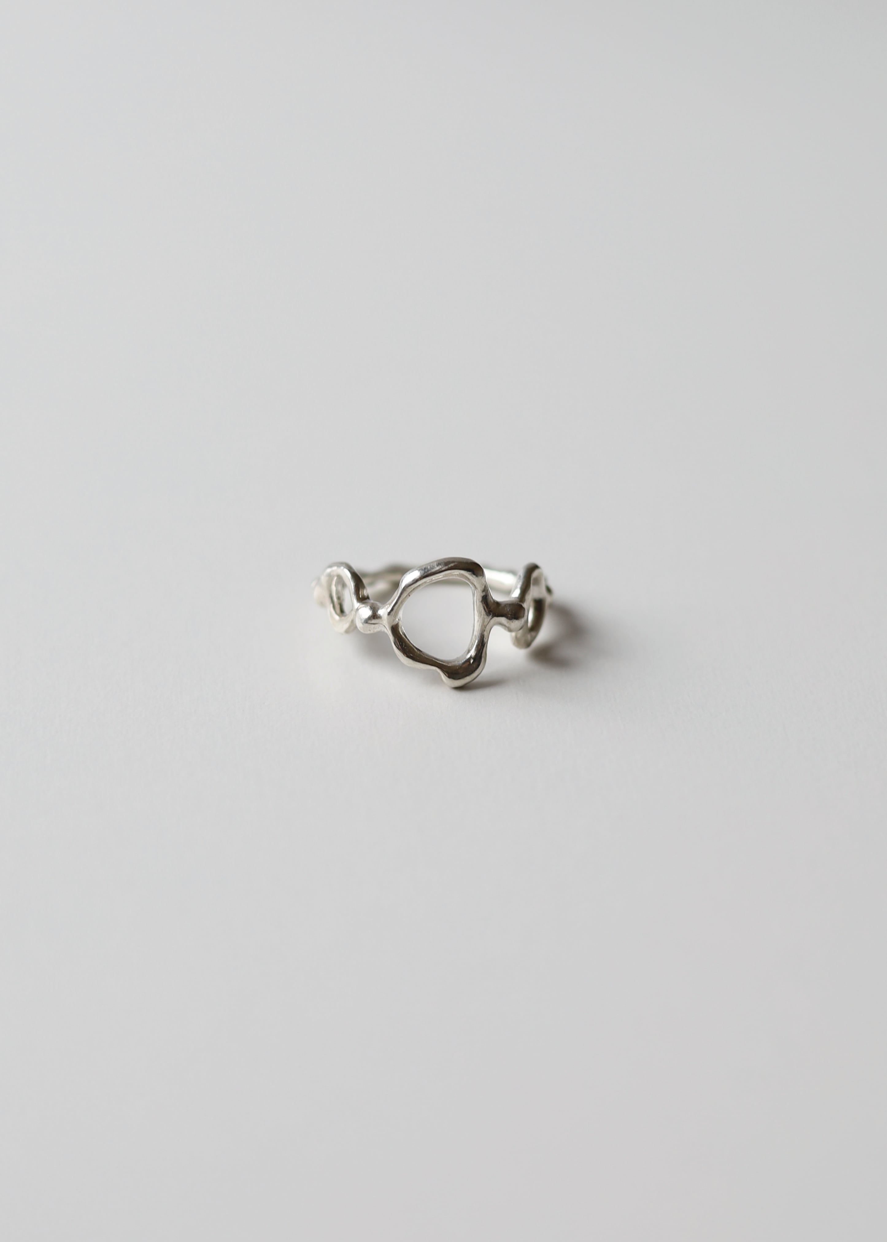 海中で揺れ動く空気をイメージした指輪。平らな面を造らず、一つひとつサイズ直しを行うため、手のひら側のデザインは唯一無二に仕上がります。
