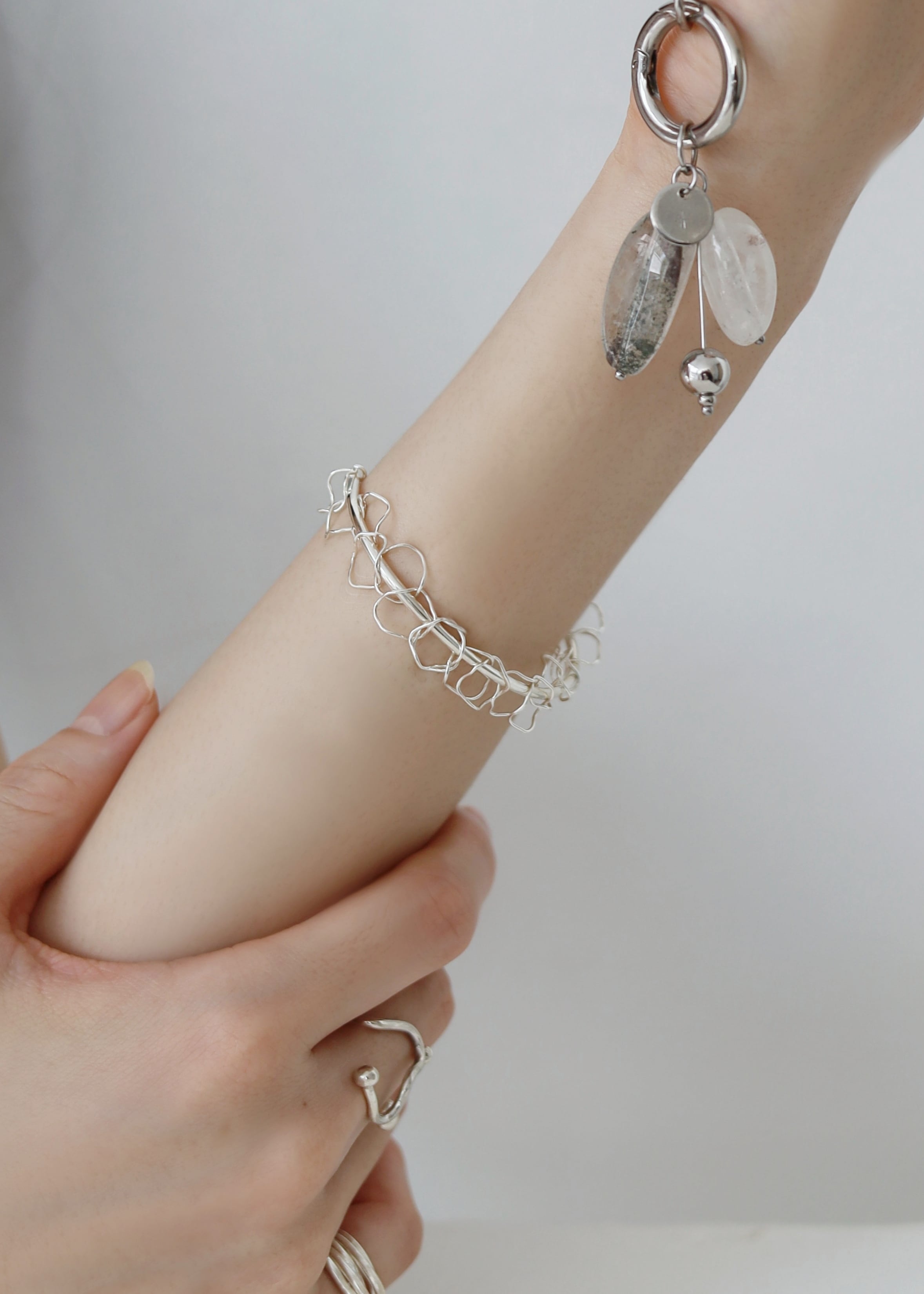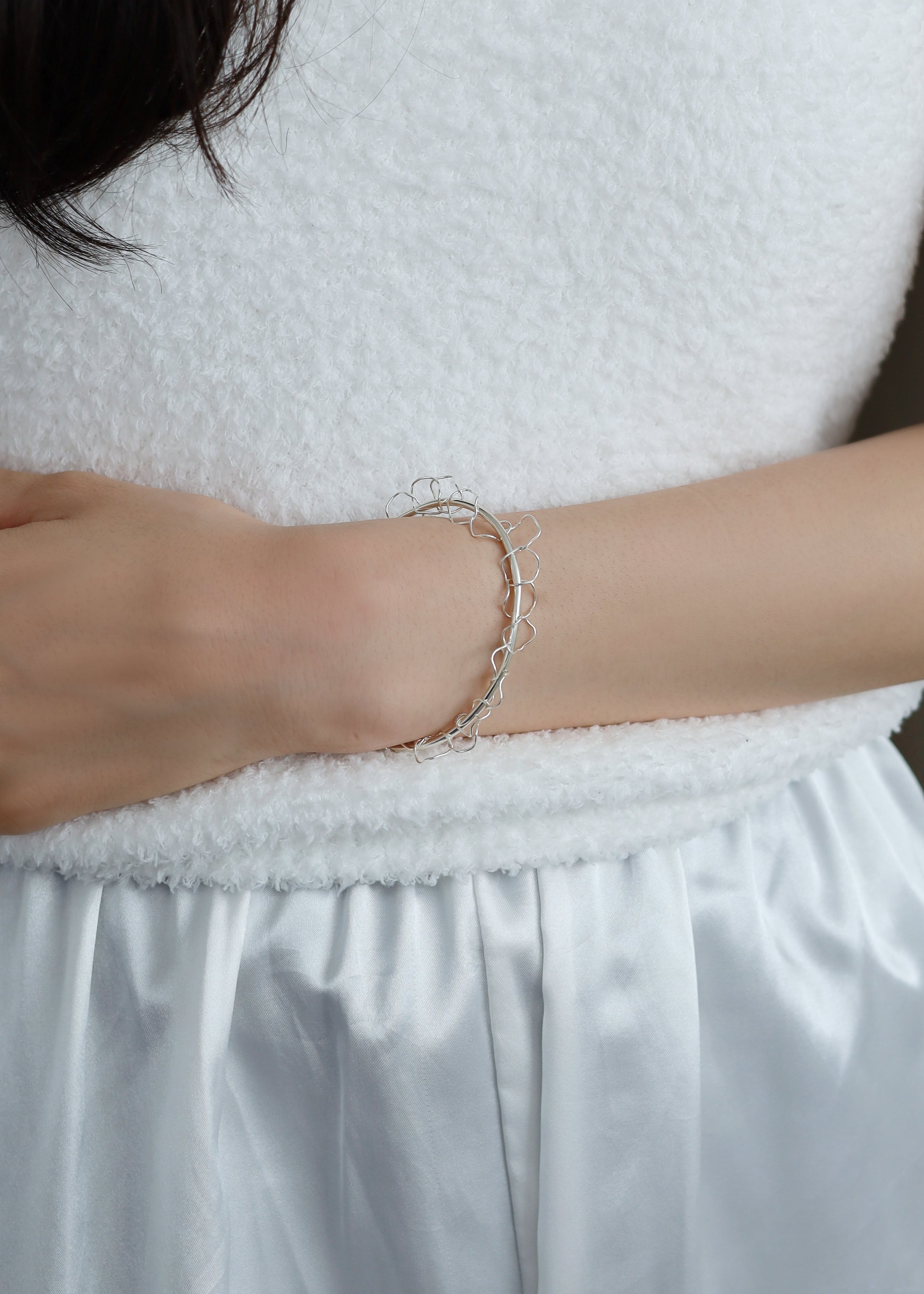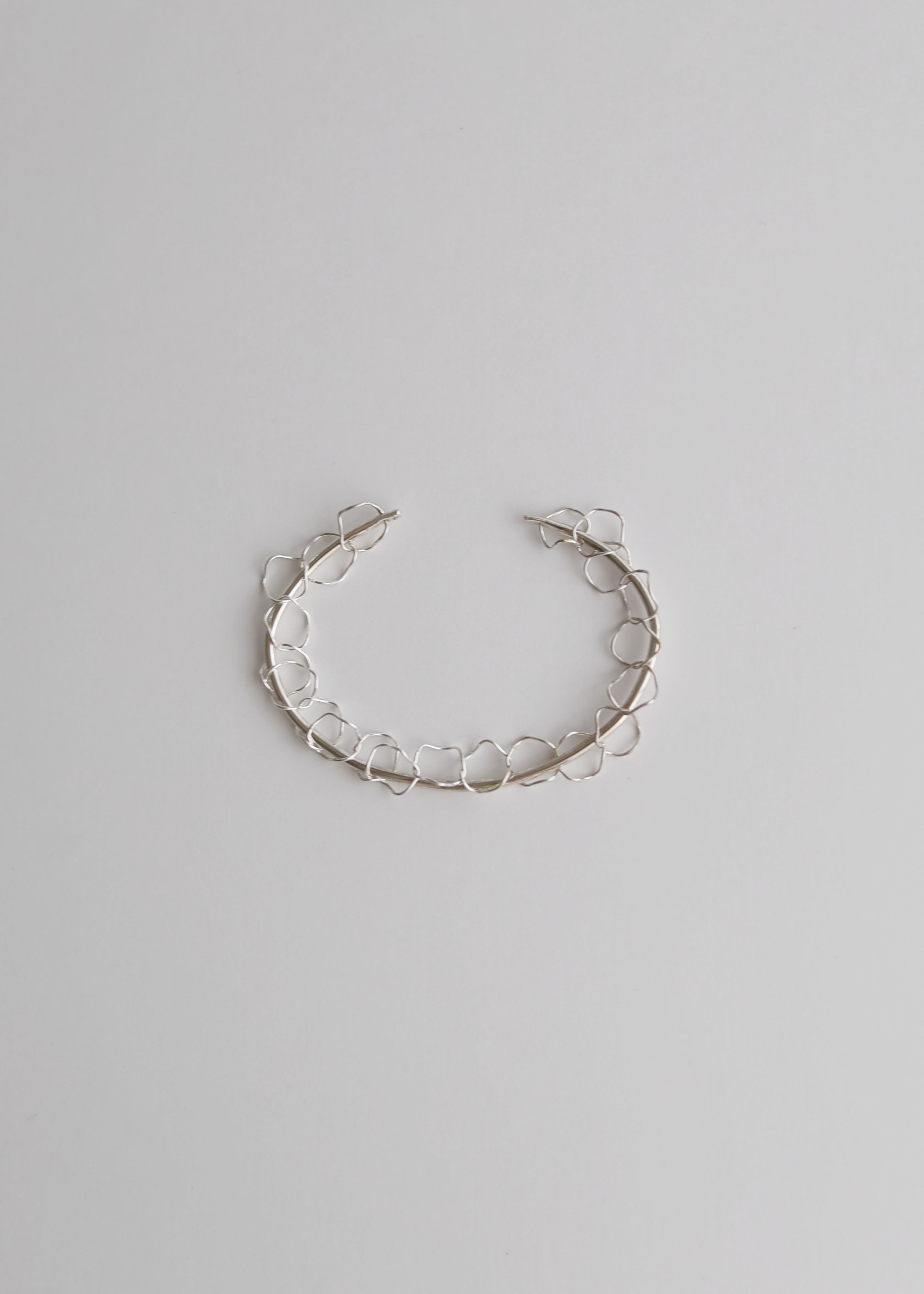 繊細な泡のようなチェーンを浮遊生物に見立てたバングル。着脱のしやすいバングルタイプです。手首に馴染むように、あえて華奢に、強くなりすぎない印象に仕上げています。ご自身で多少のサイズ調整が可能ですが、繊細なため無理に開かず、手首の細い部分に通してから回すようにしてご着用ください。
