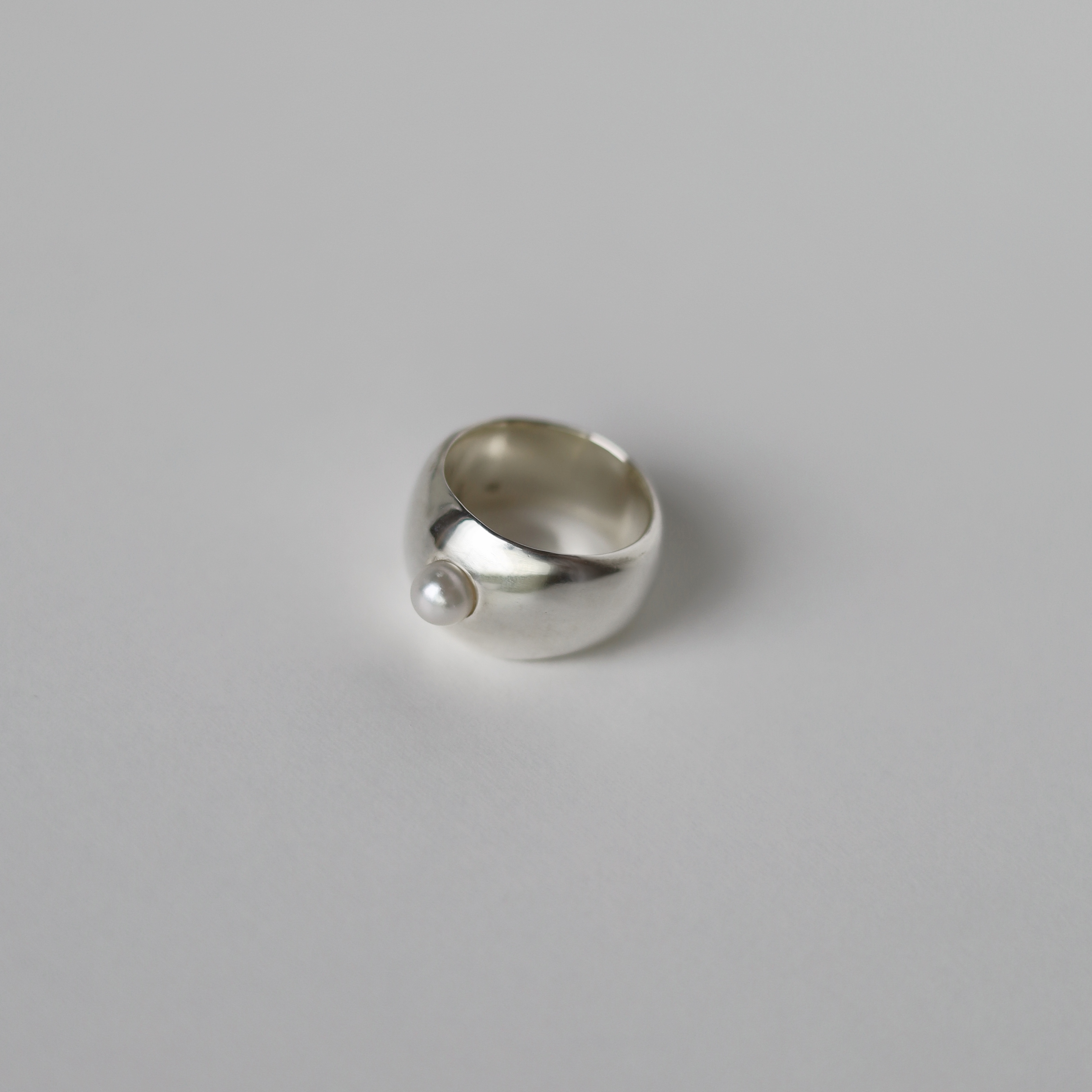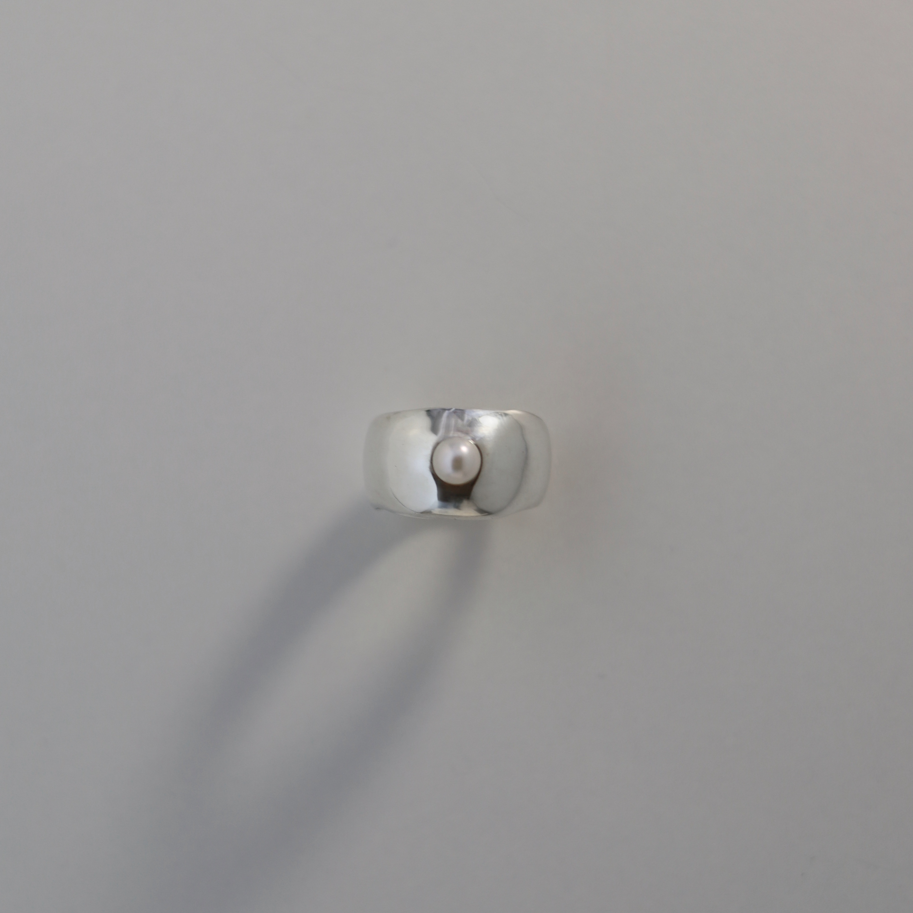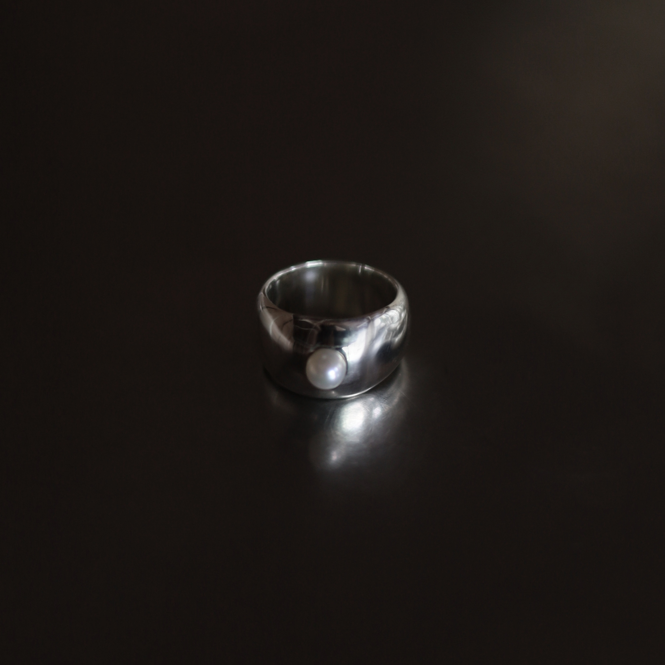 国産のあこや真珠を、シルバーに埋めたようにセッティングしたデザイン。幅広のリングに元々そこに真珠があったかのように配置しています。爪がないため、引っかかりも少なく着用可能。幅広のデザインのため、いつものリングサイズより2号ほど大きいサイズを推奨します。