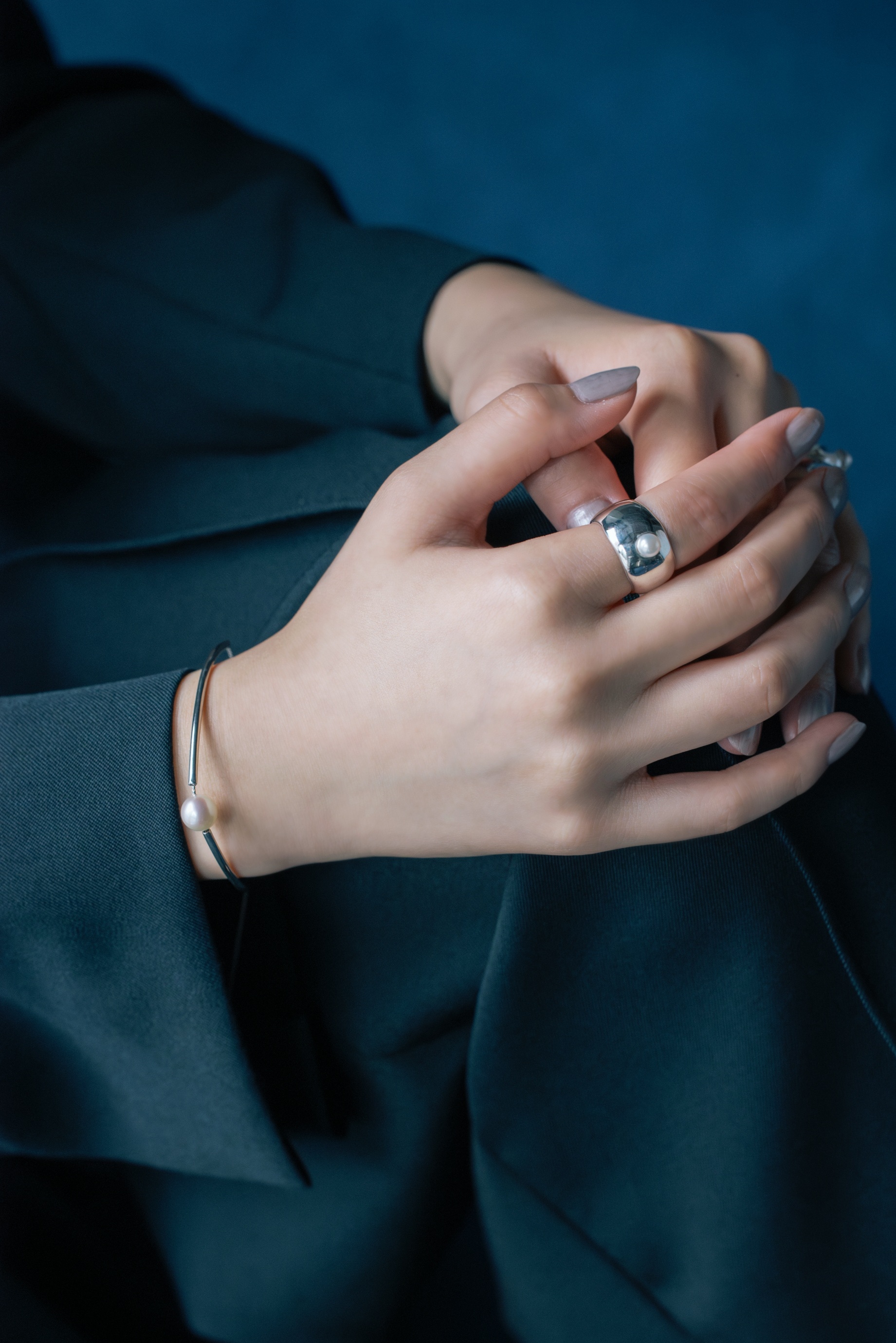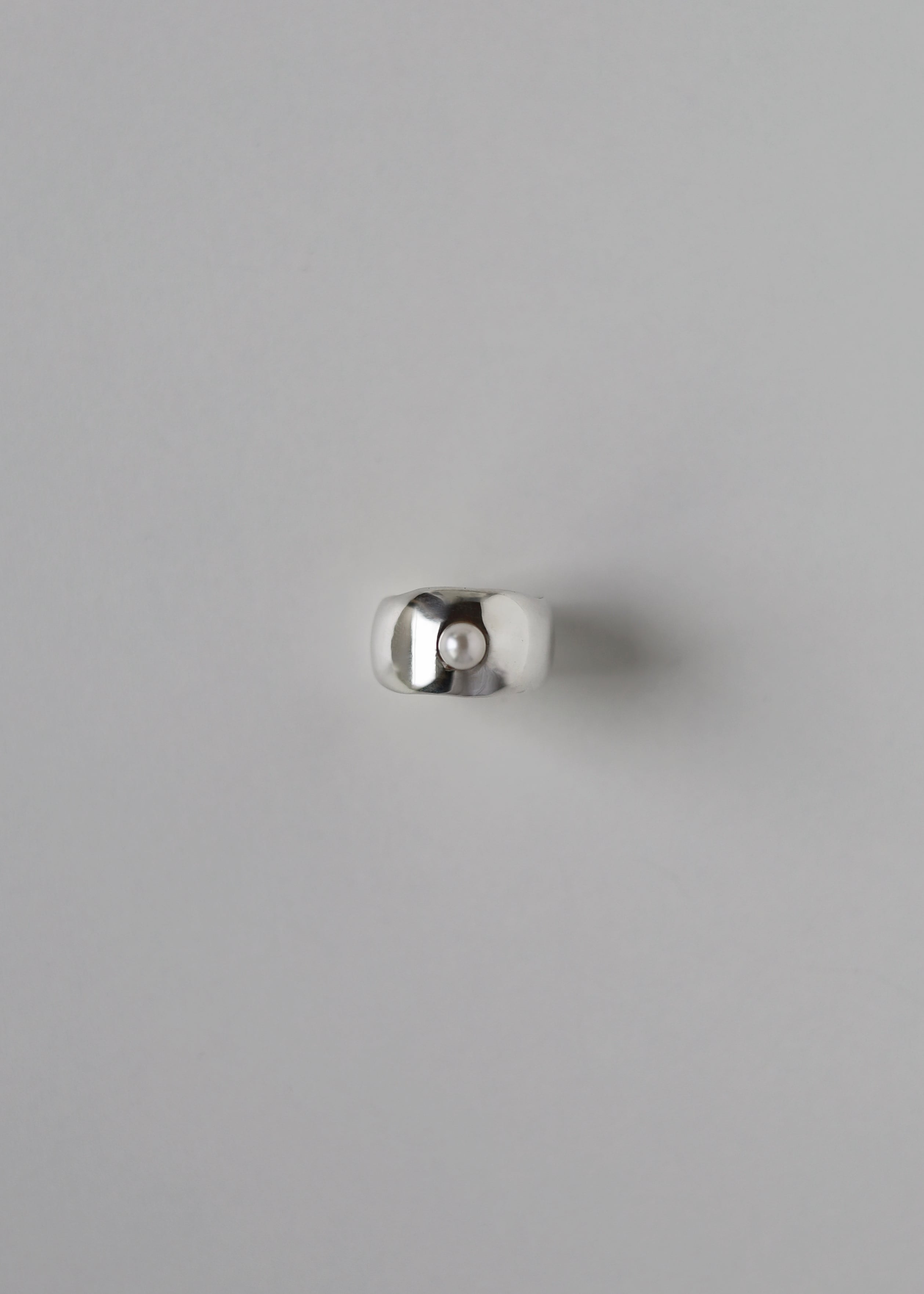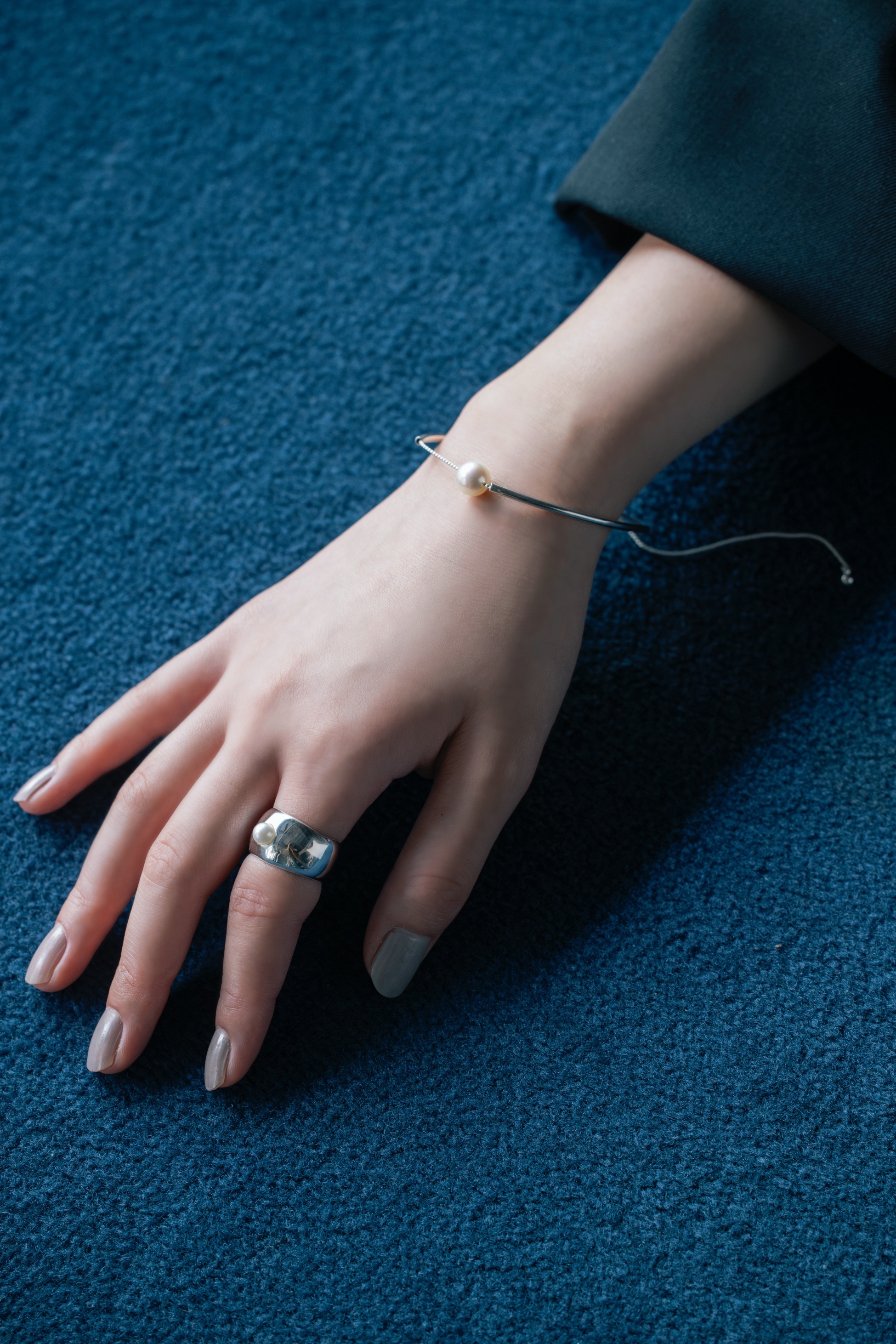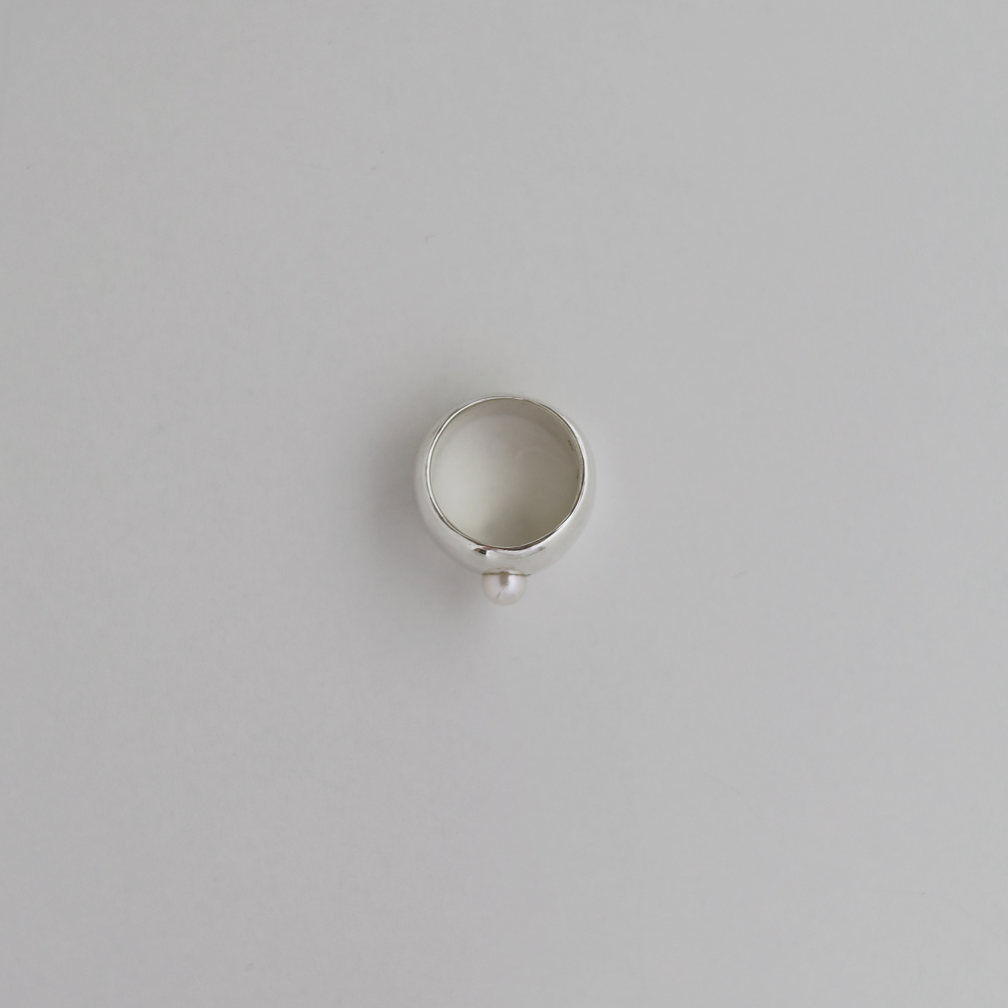 国産のあこや真珠を、シルバーに埋めたようにセッティングしたデザイン。幅広のリングに元々そこに真珠があったかのように配置しています。爪がないため、引っかかりも少なく着用可能。幅広のデザインのため、いつものリングサイズより2号ほど大きいサイズを推奨します。