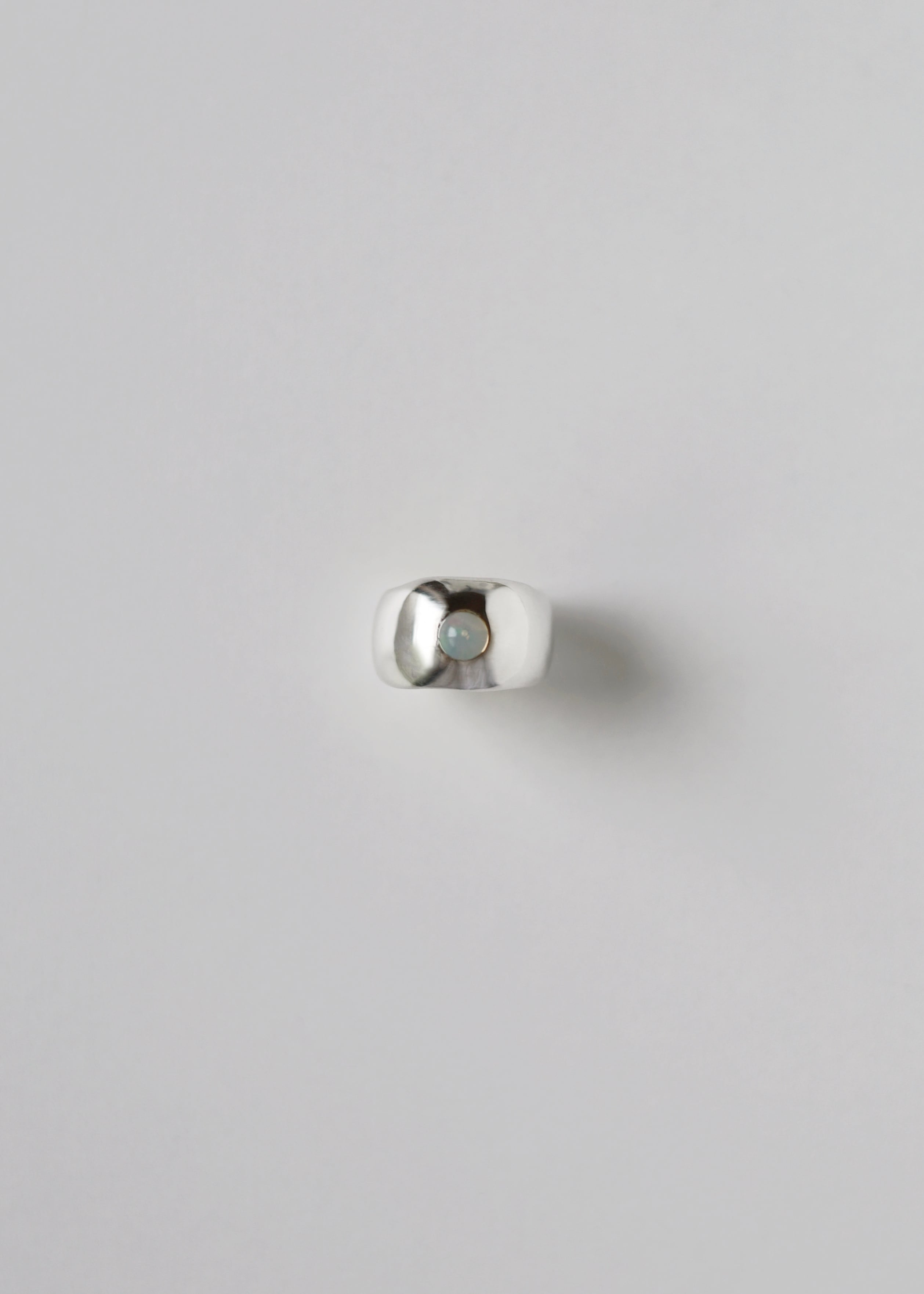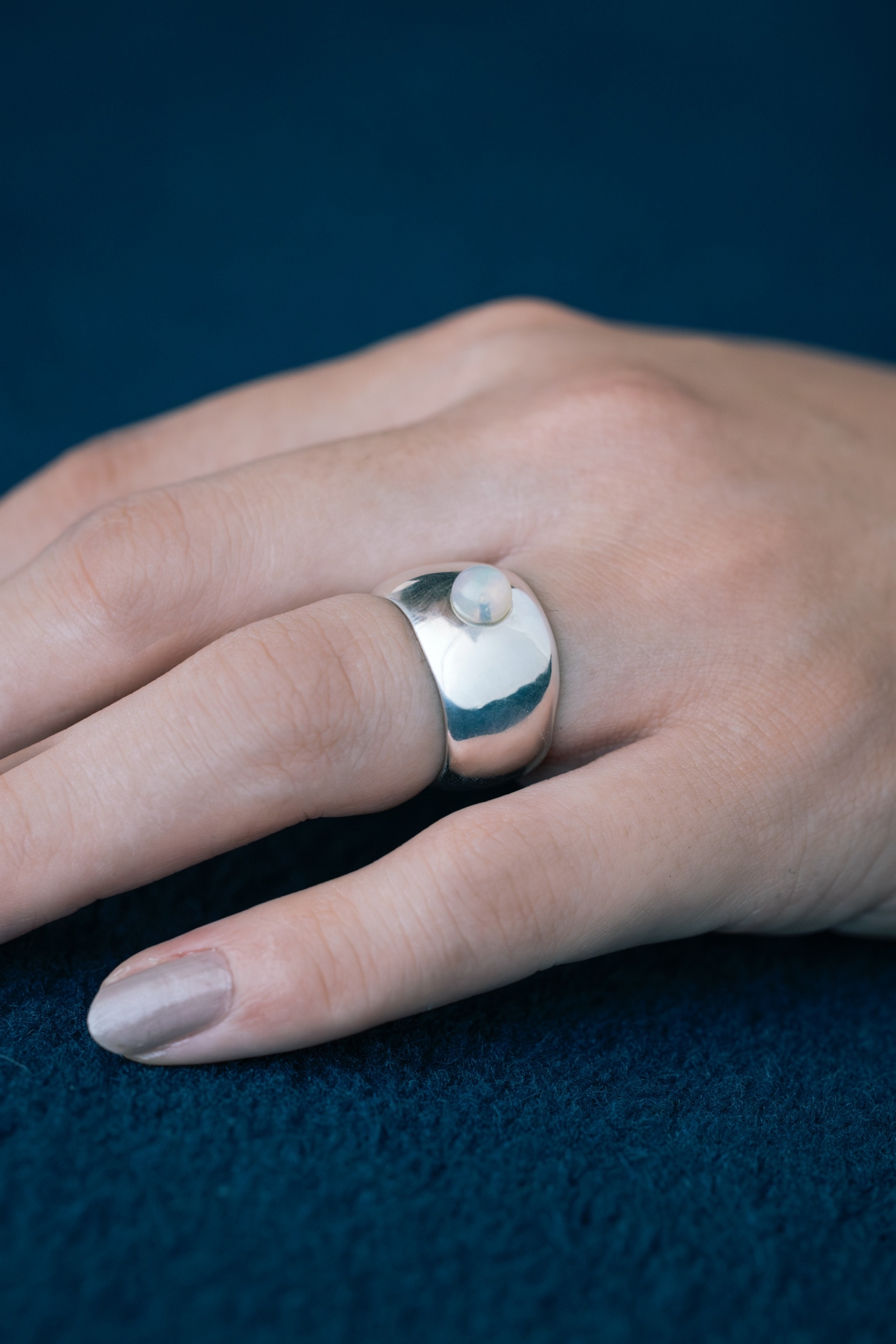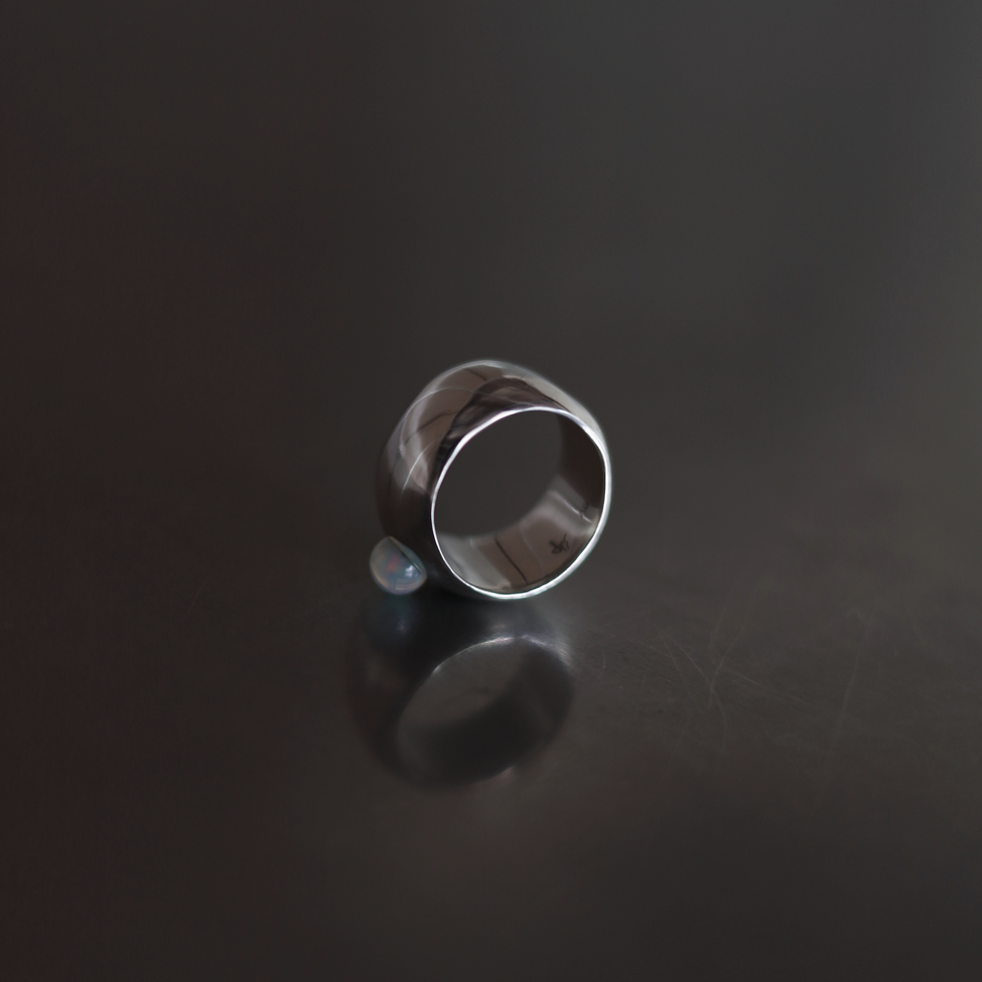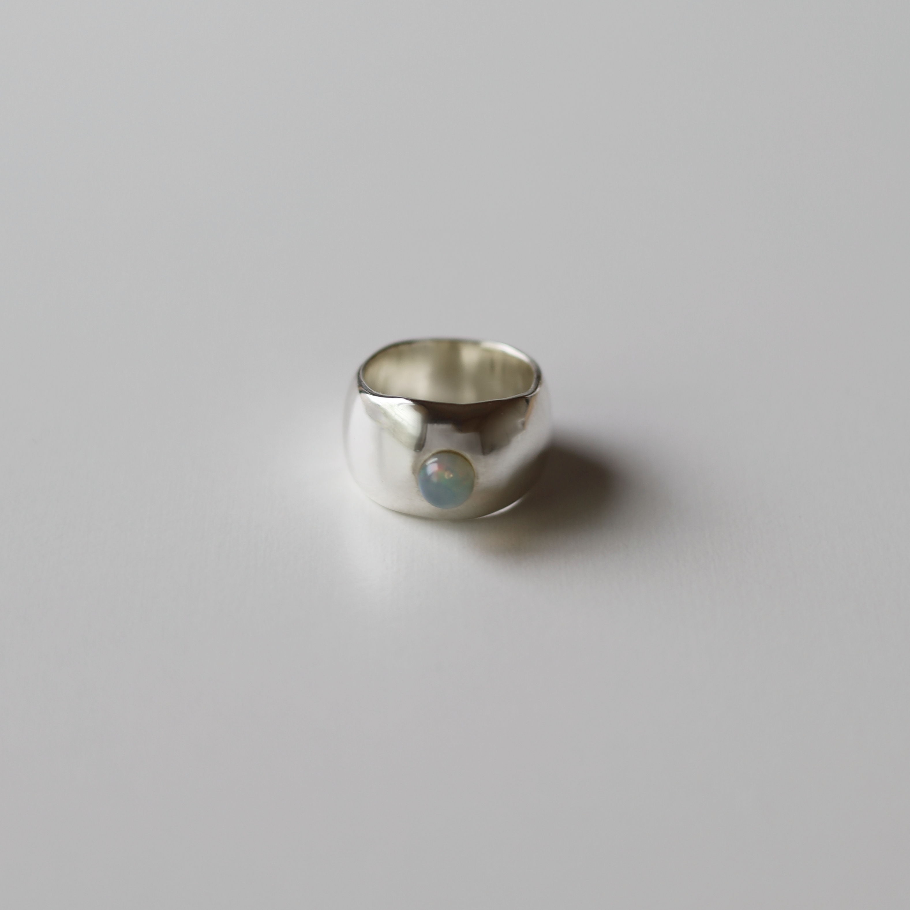 白みの強いオパールをシルバーに埋め込んだように留めたデザイン。幅広のリングに元々そこに石があったかのように配置しています。爪がないため、引っかかりも少なく着用可能。幅広のデザインのためいつものリングサイズより、2号ほど大きいサイズを推奨します。