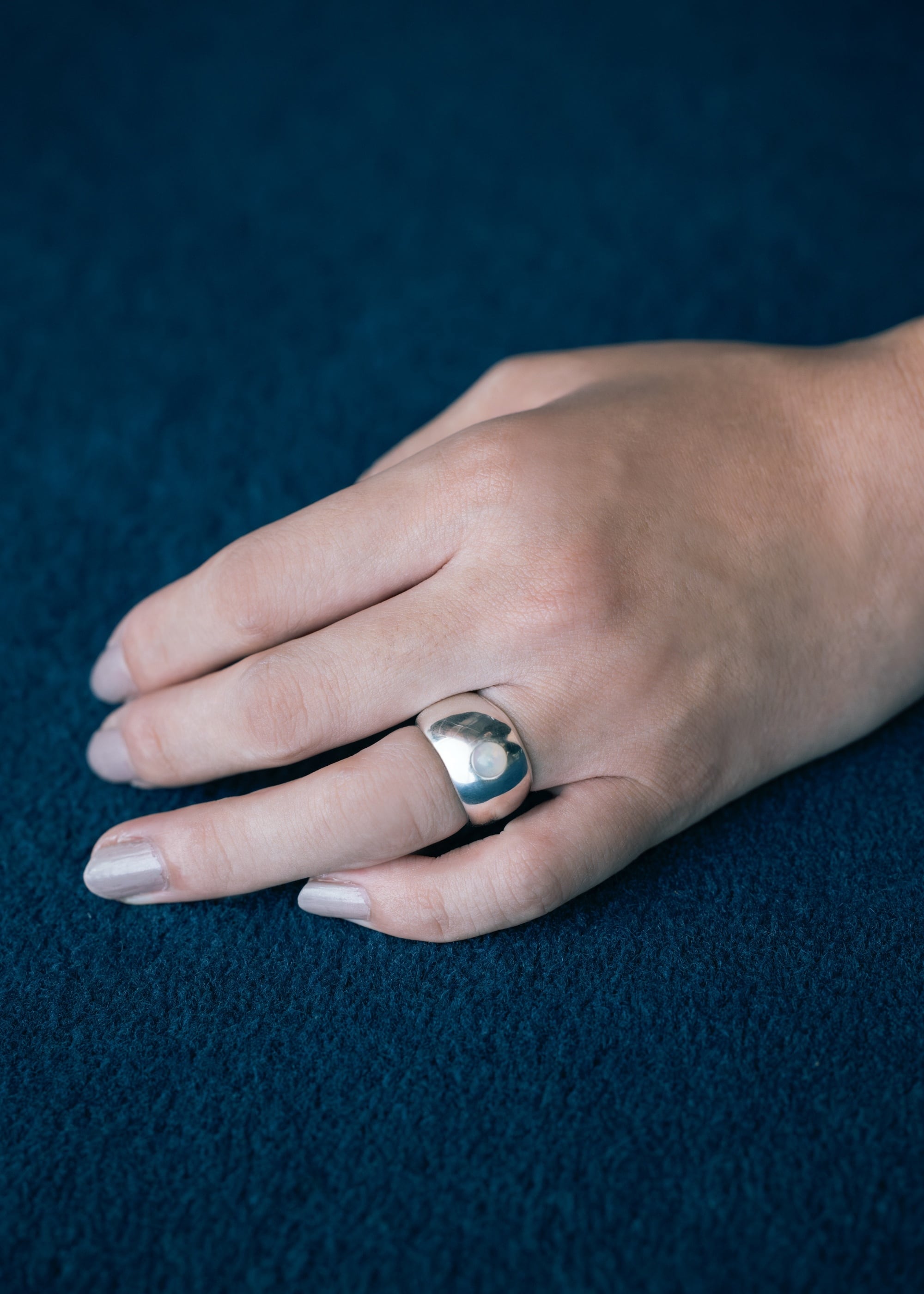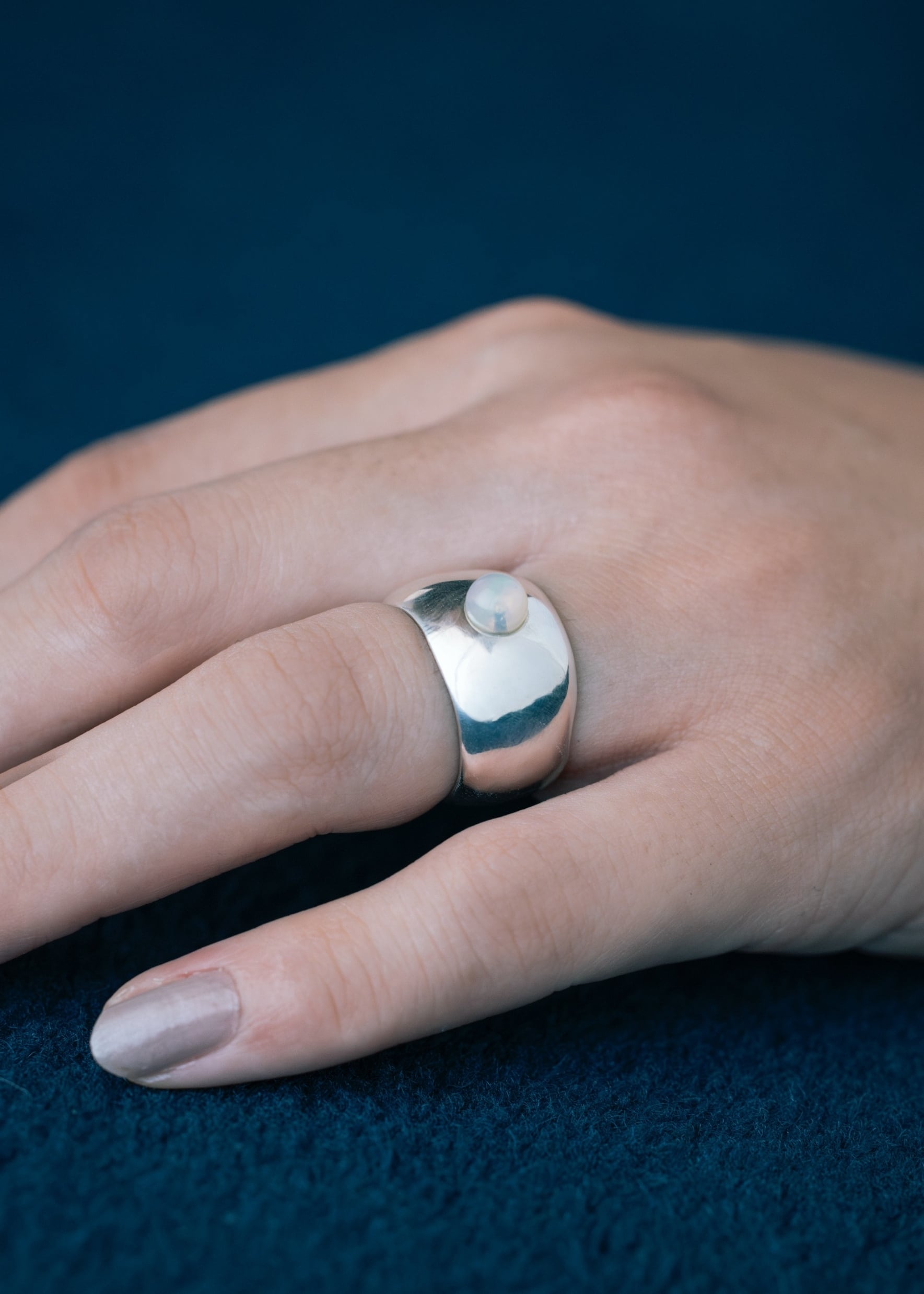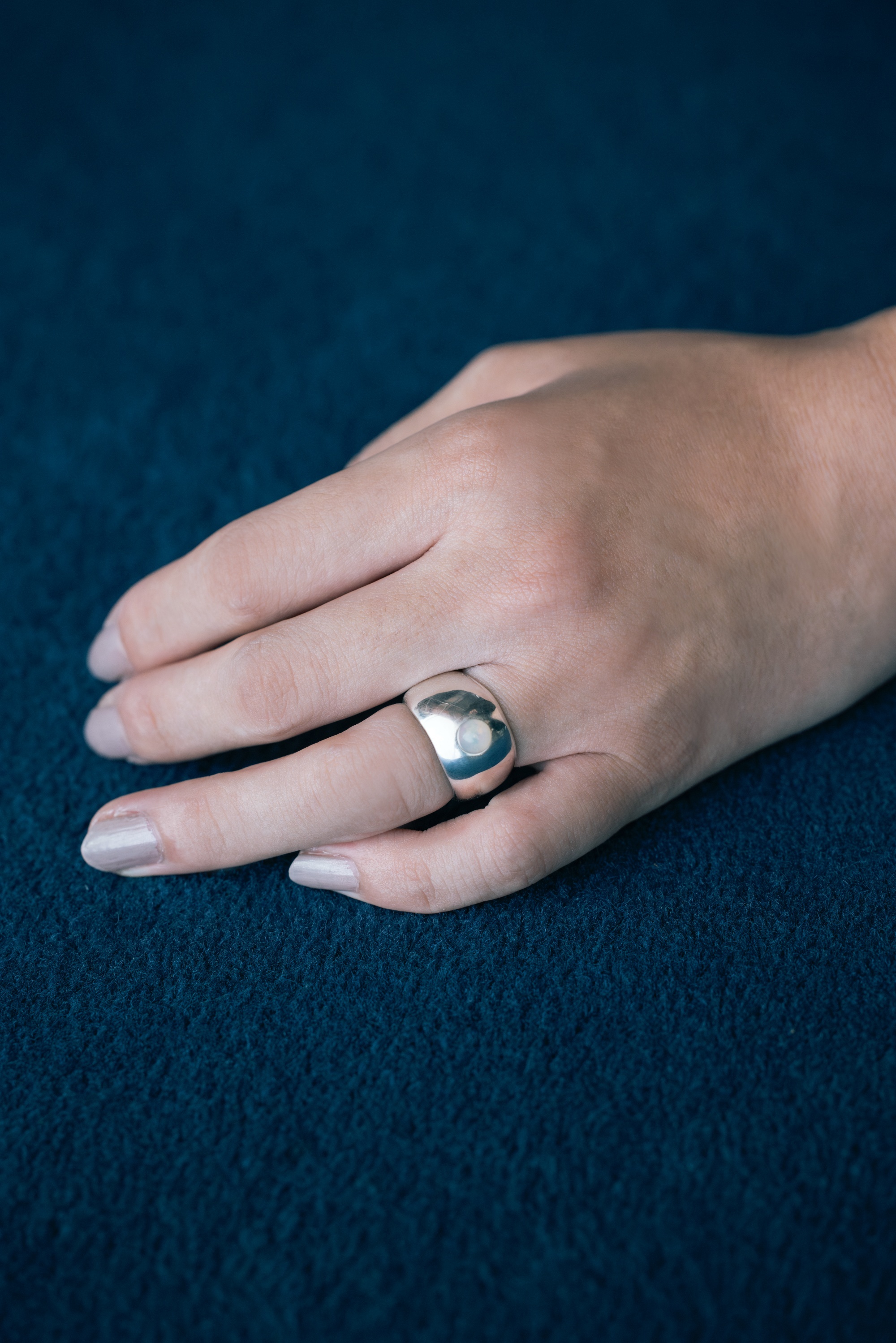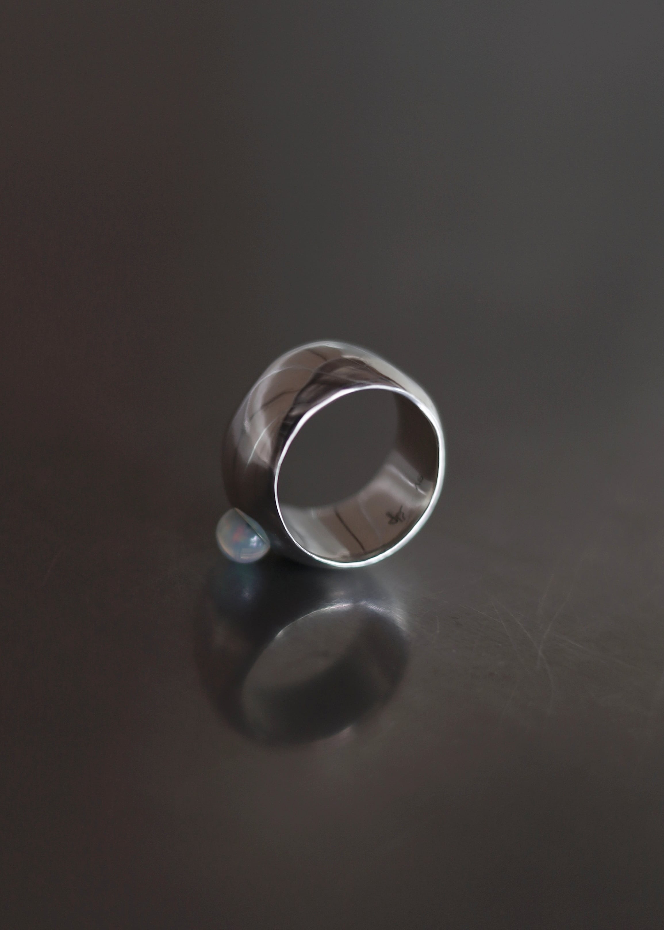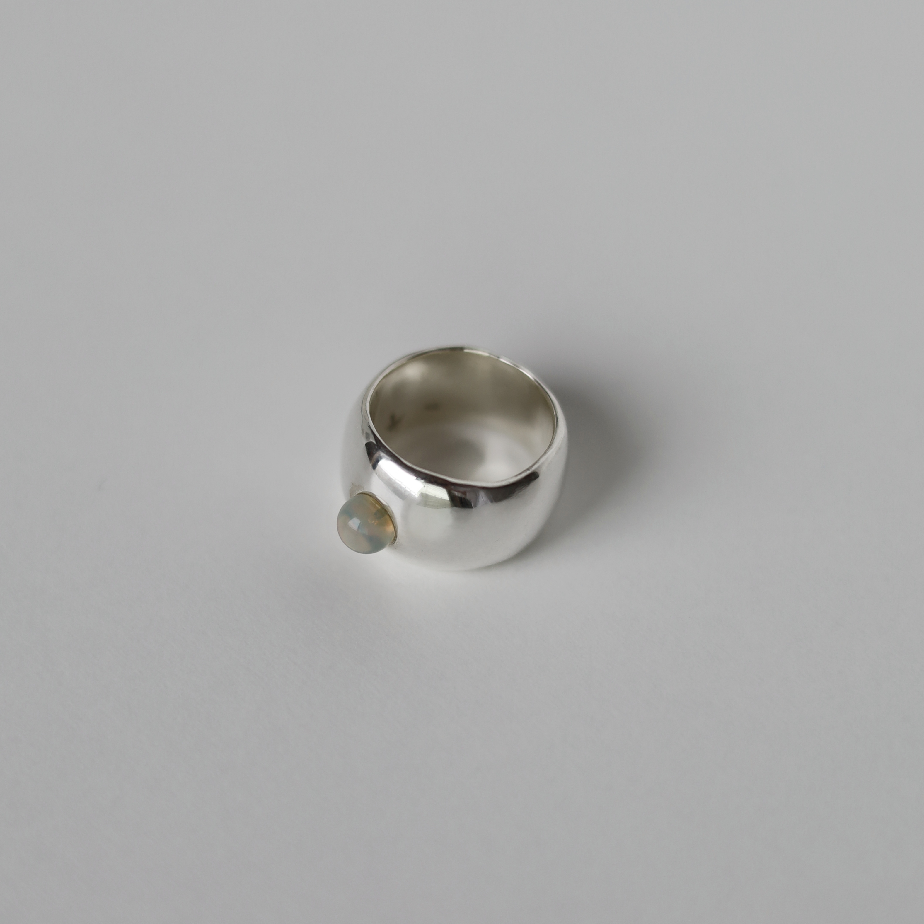 白みの強いオパールをシルバーに埋め込んだように留めたデザイン。幅広のリングに元々そこに石があったかのように配置しています。爪がないため、引っかかりも少なく着用可能。幅広のデザインのためいつものリングサイズより、2号ほど大きいサイズを推奨します。