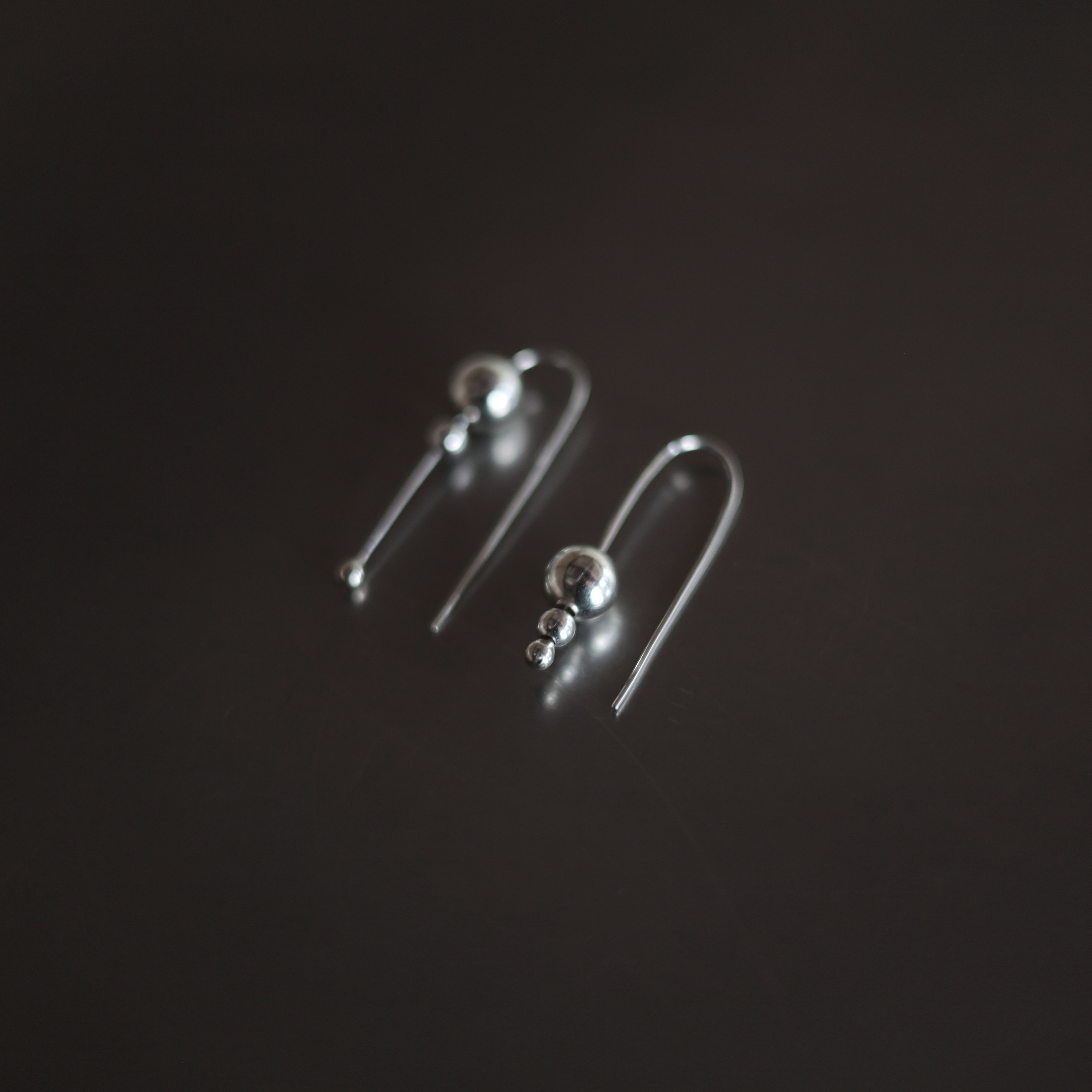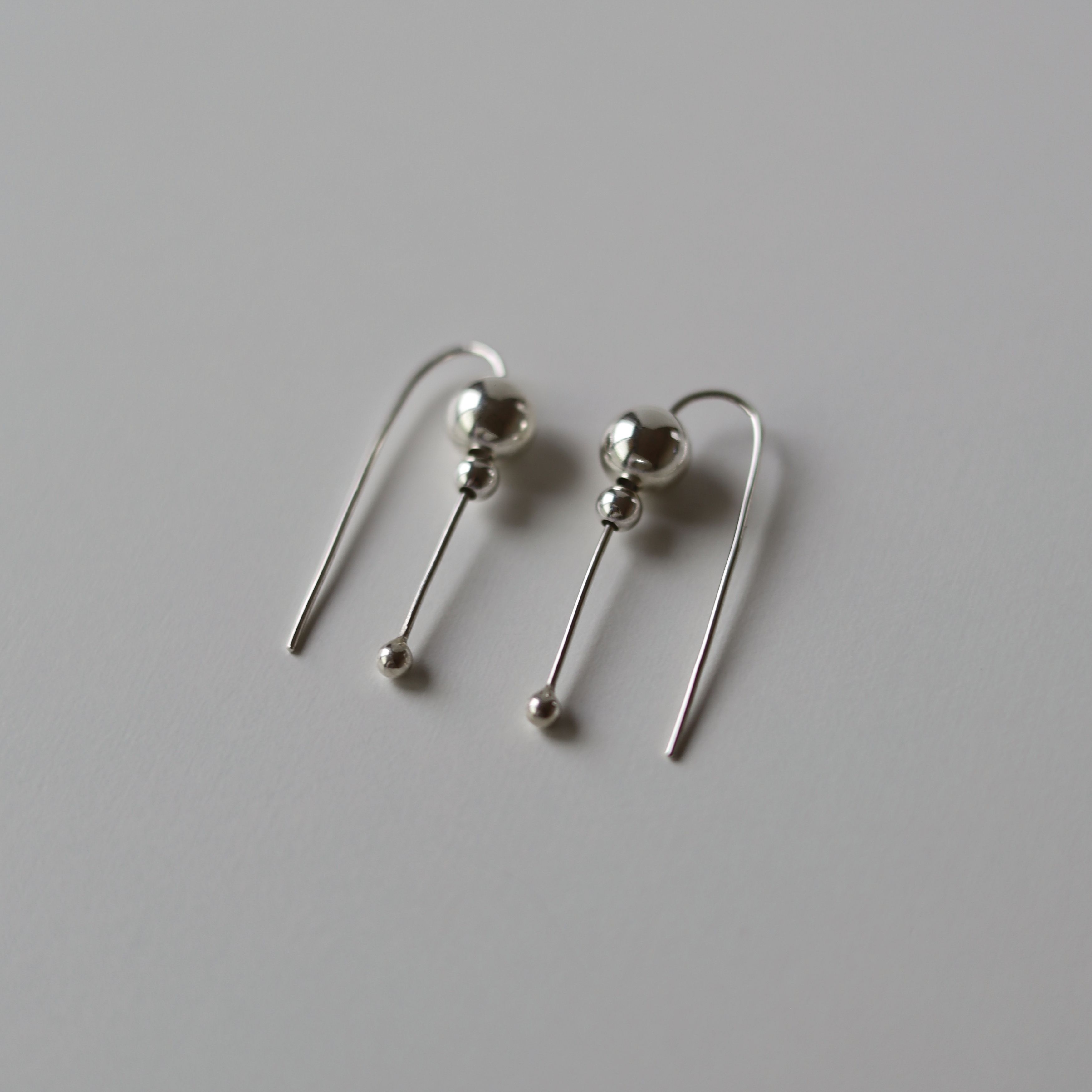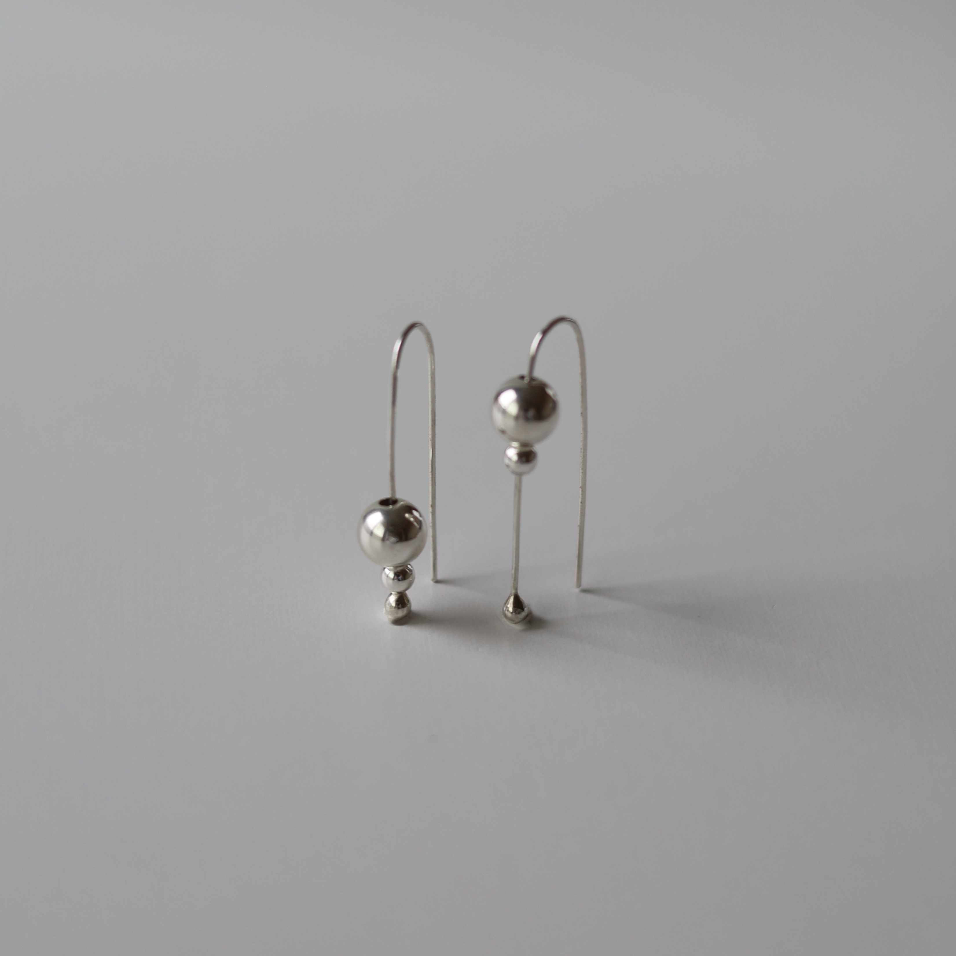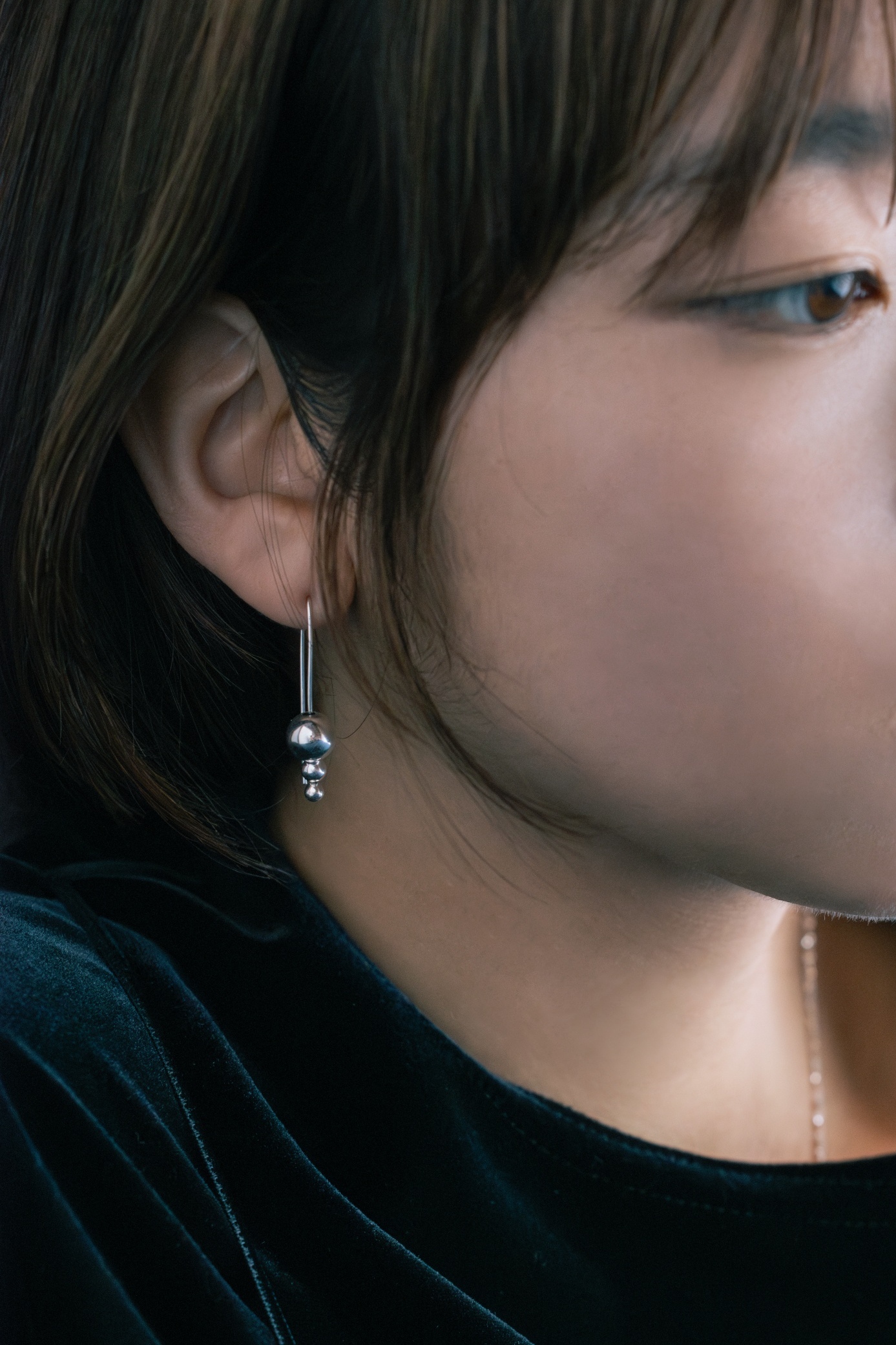 大きさの違うシルバーボールを並べ、キャッチが無くてもバランスよく耳に収まるようにデザインしたワイヤーピアス。丸みと強さのバランスをとり、程よい存在感に。真ん中のシルバーボールは可動し、好きな位置に固定できます。フォーマルシーンではシンメトリーに配置、カジュアルシーンではアシンメトリーに配置するなど、変化を楽しめるデザイン。