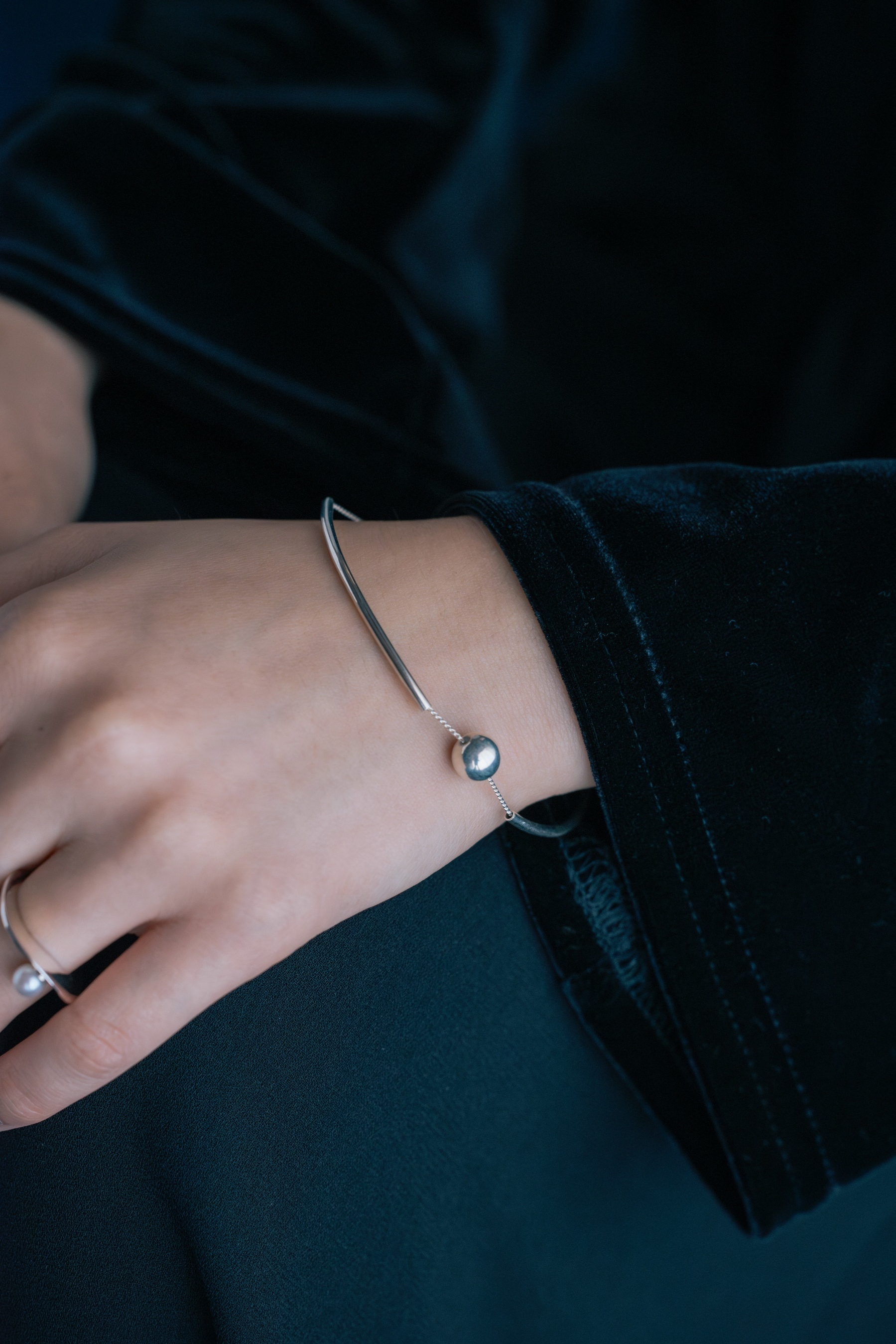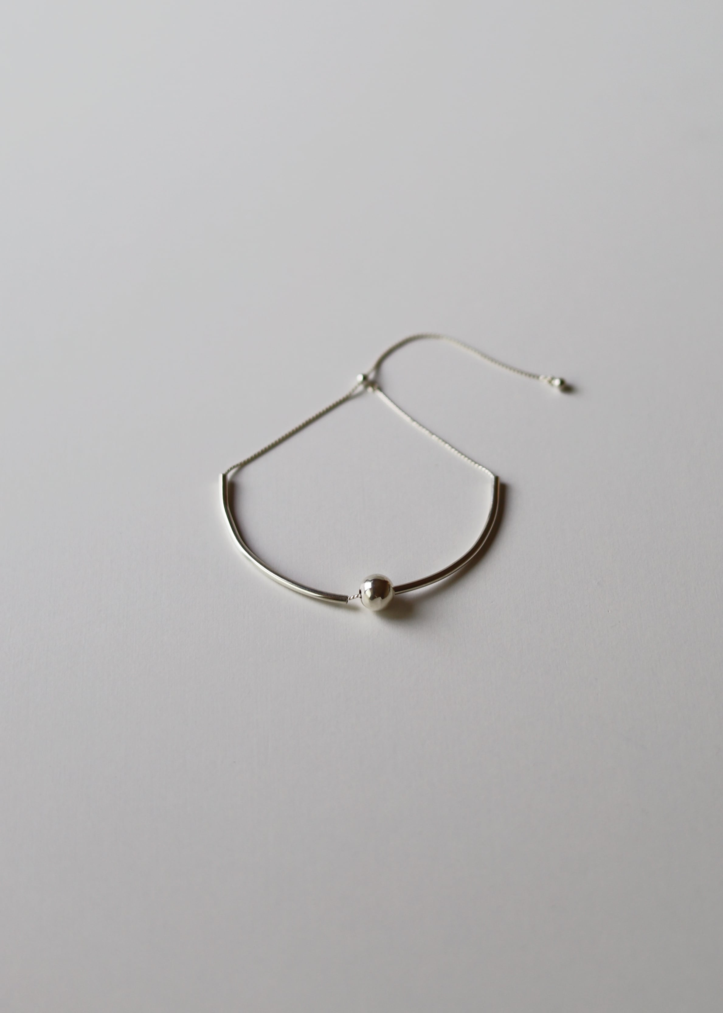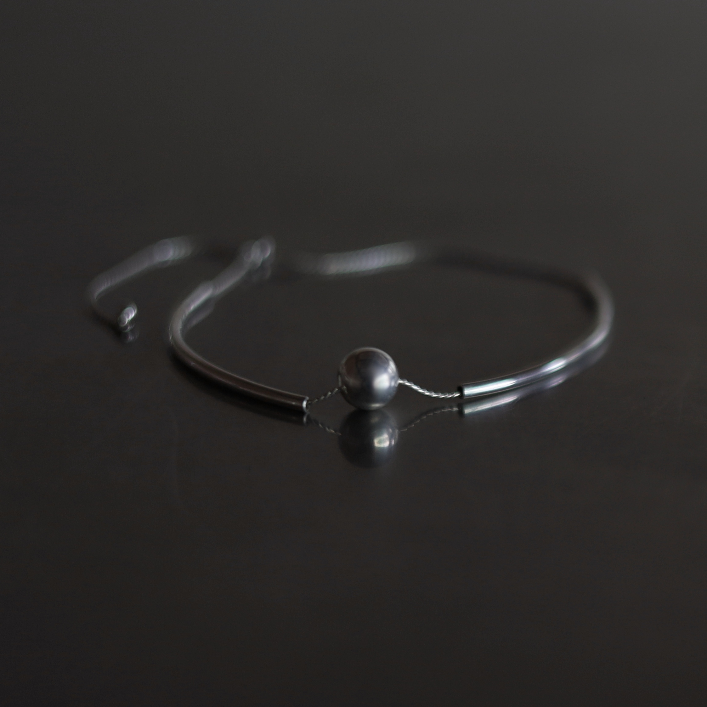 シルバーボールとバーを組み合わせたさりげない存在感が特徴のブレスレット。どんなテイストのファッションにも馴染み、季節問わず楽しめるタイムレスなデザイン。シリコンボールで着脱、長さ調節が可能。金具が目立たず、360度どこから見てもすっきりと見える点がポイント。