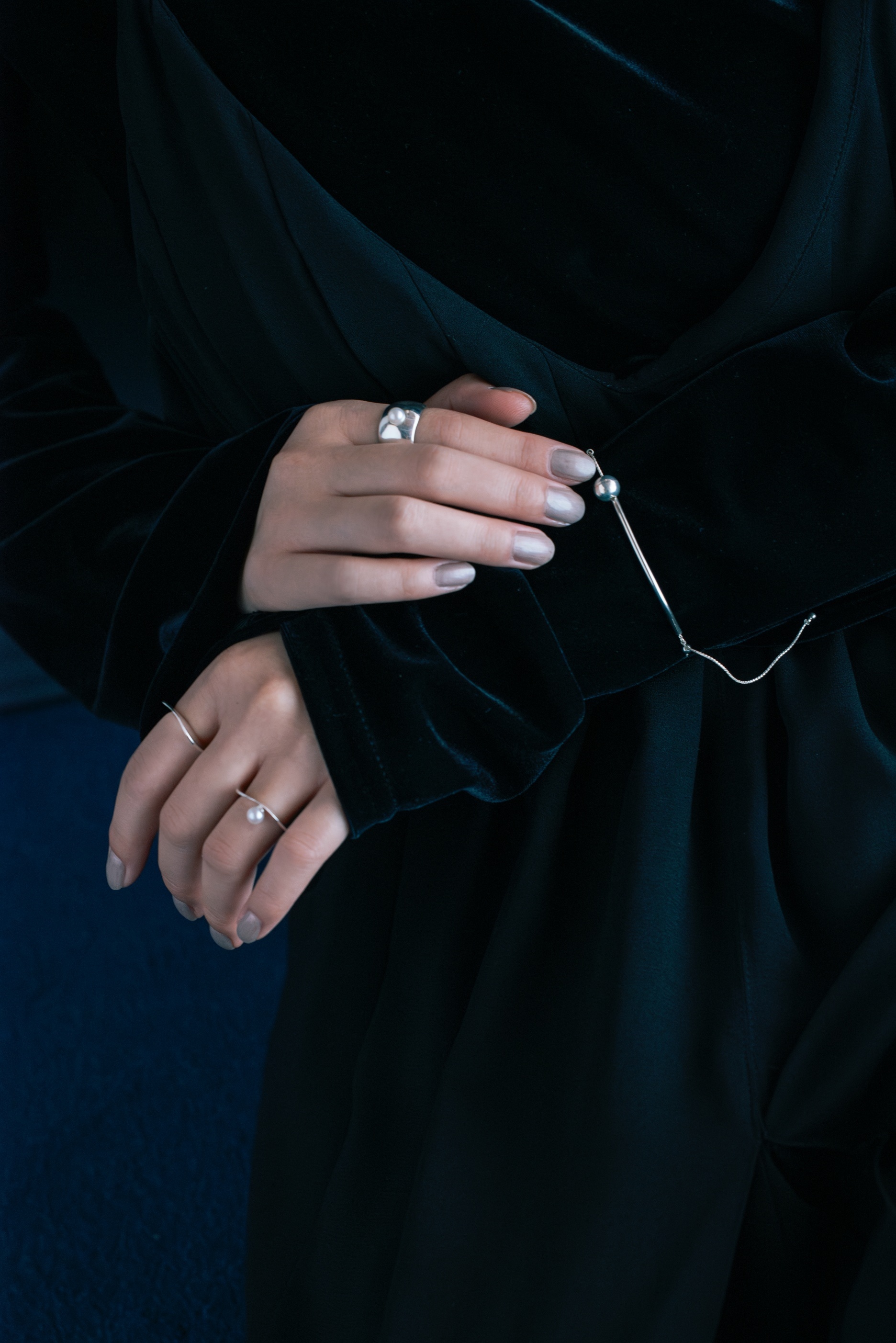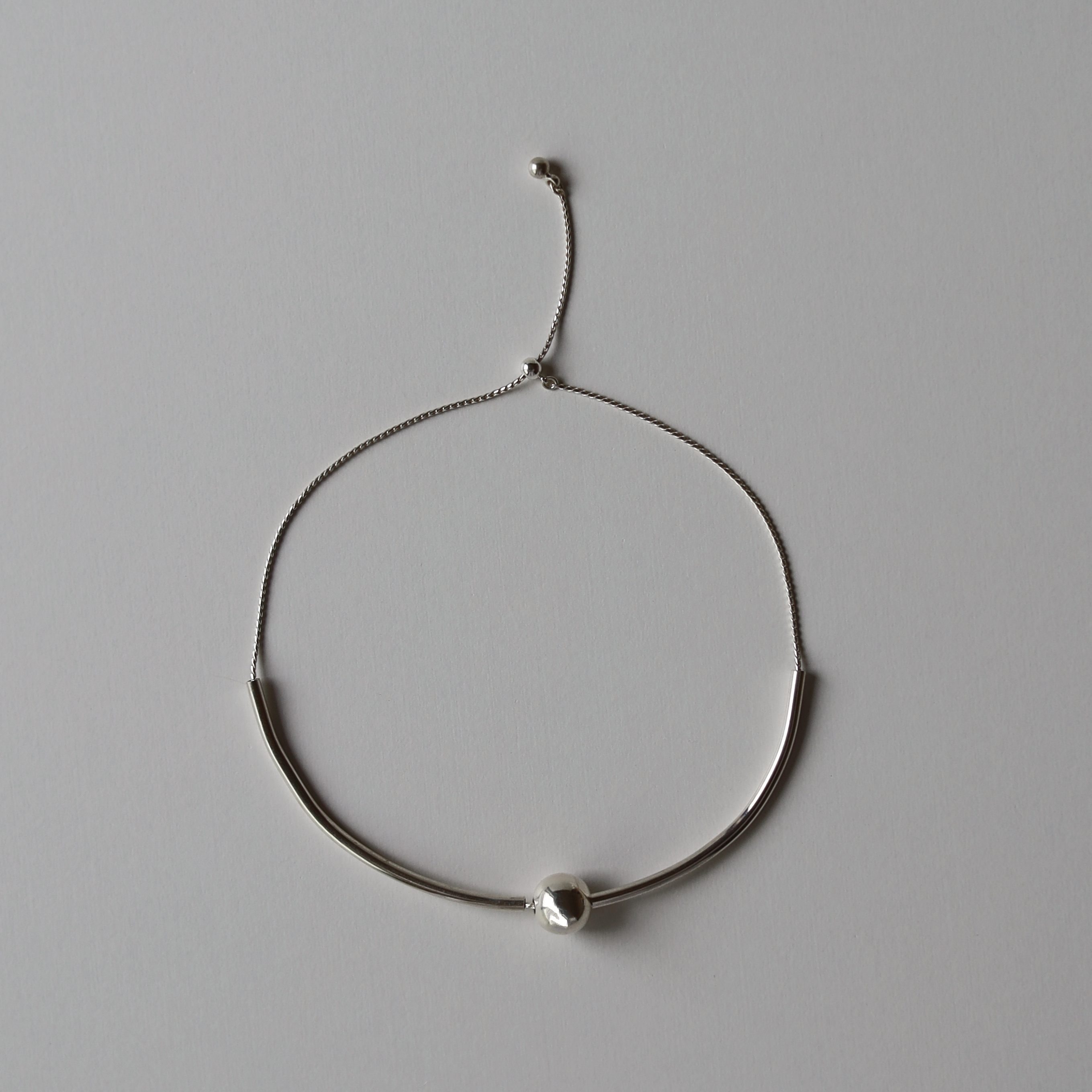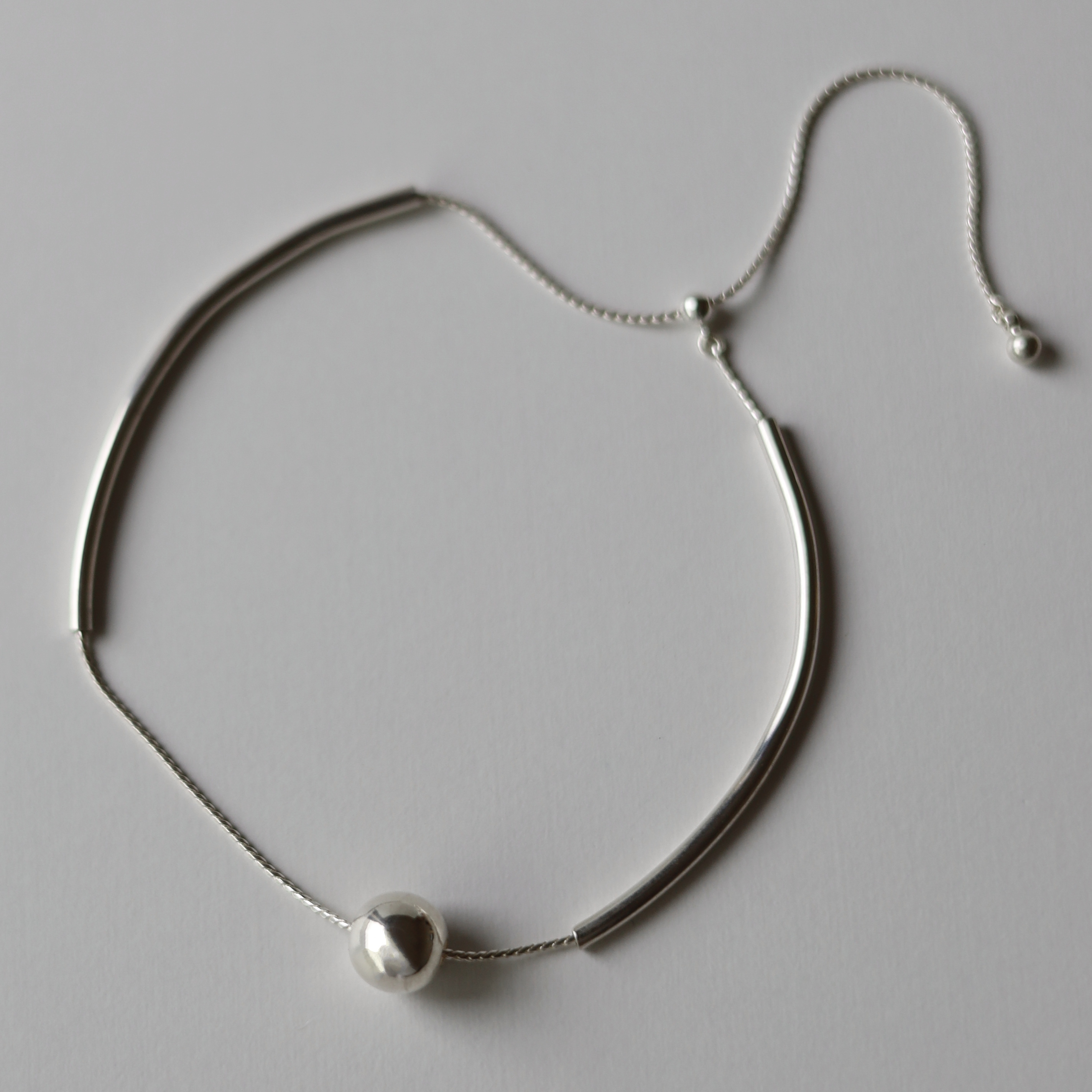 シルバーボールとバーを組み合わせたさりげない存在感が特徴のブレスレット。どんなテイストのファッションにも馴染み、季節問わず楽しめるタイムレスなデザイン。シリコンボールで着脱、長さ調節が可能。金具が目立たず、360度どこから見てもすっきりと見える点がポイント。