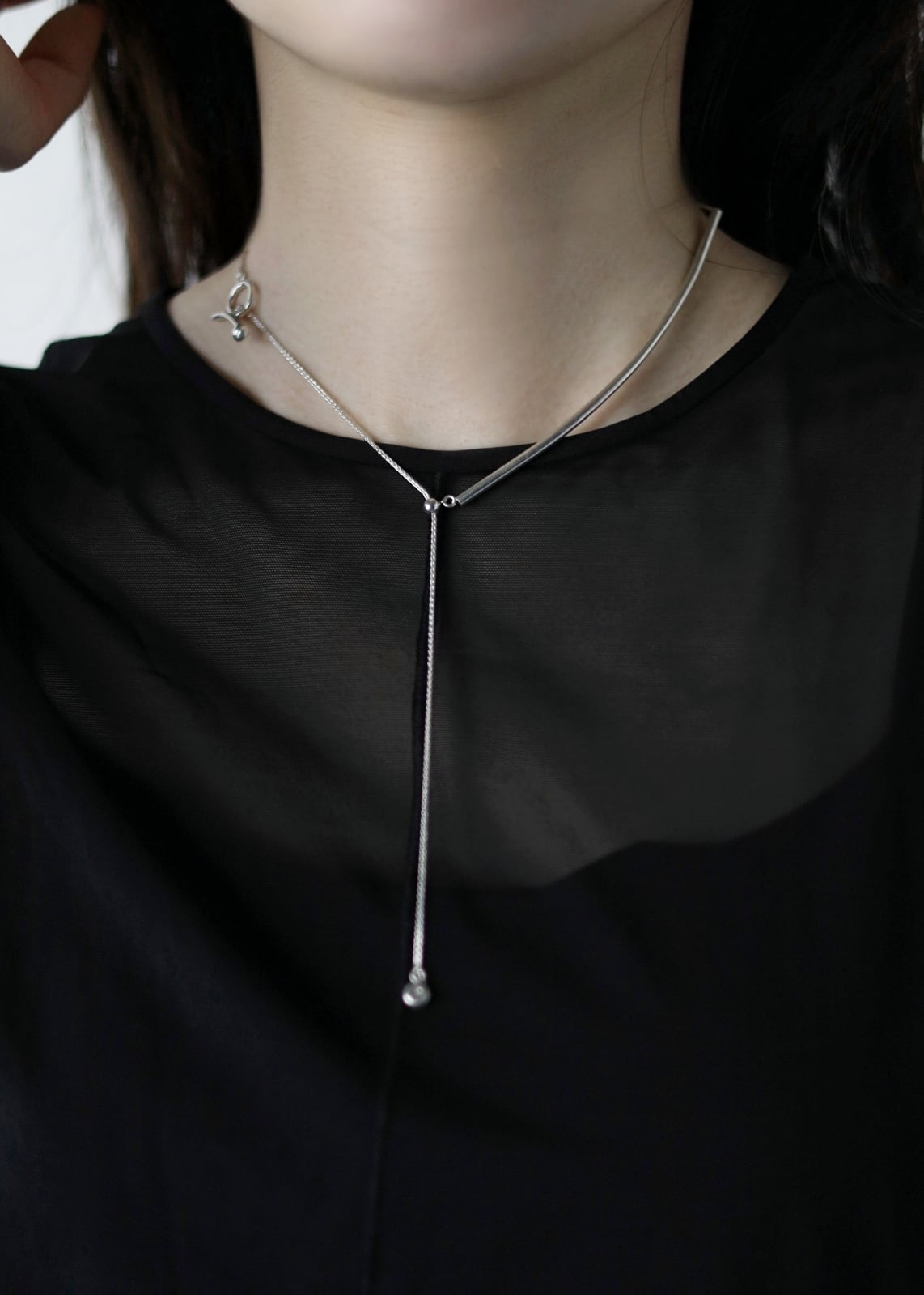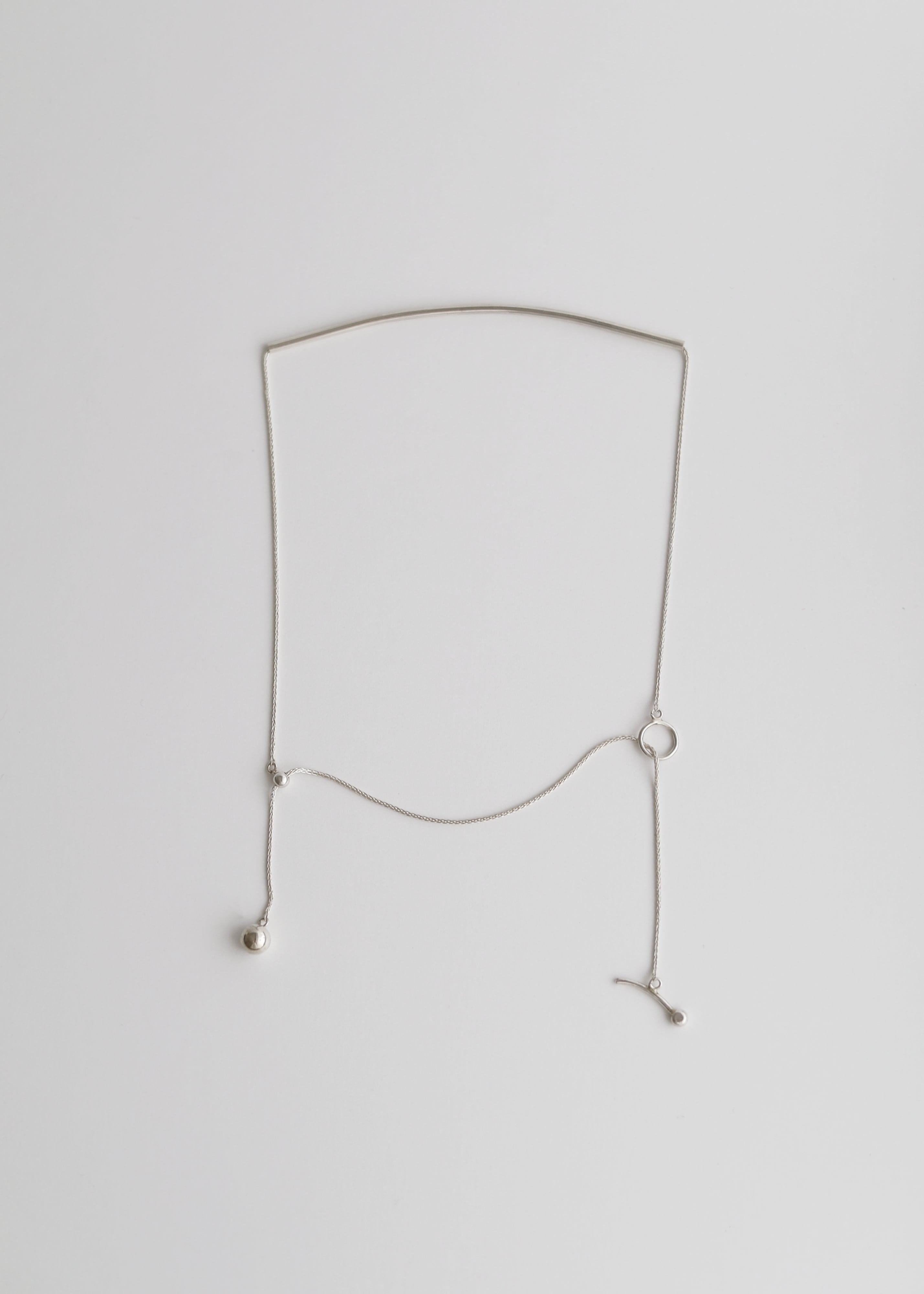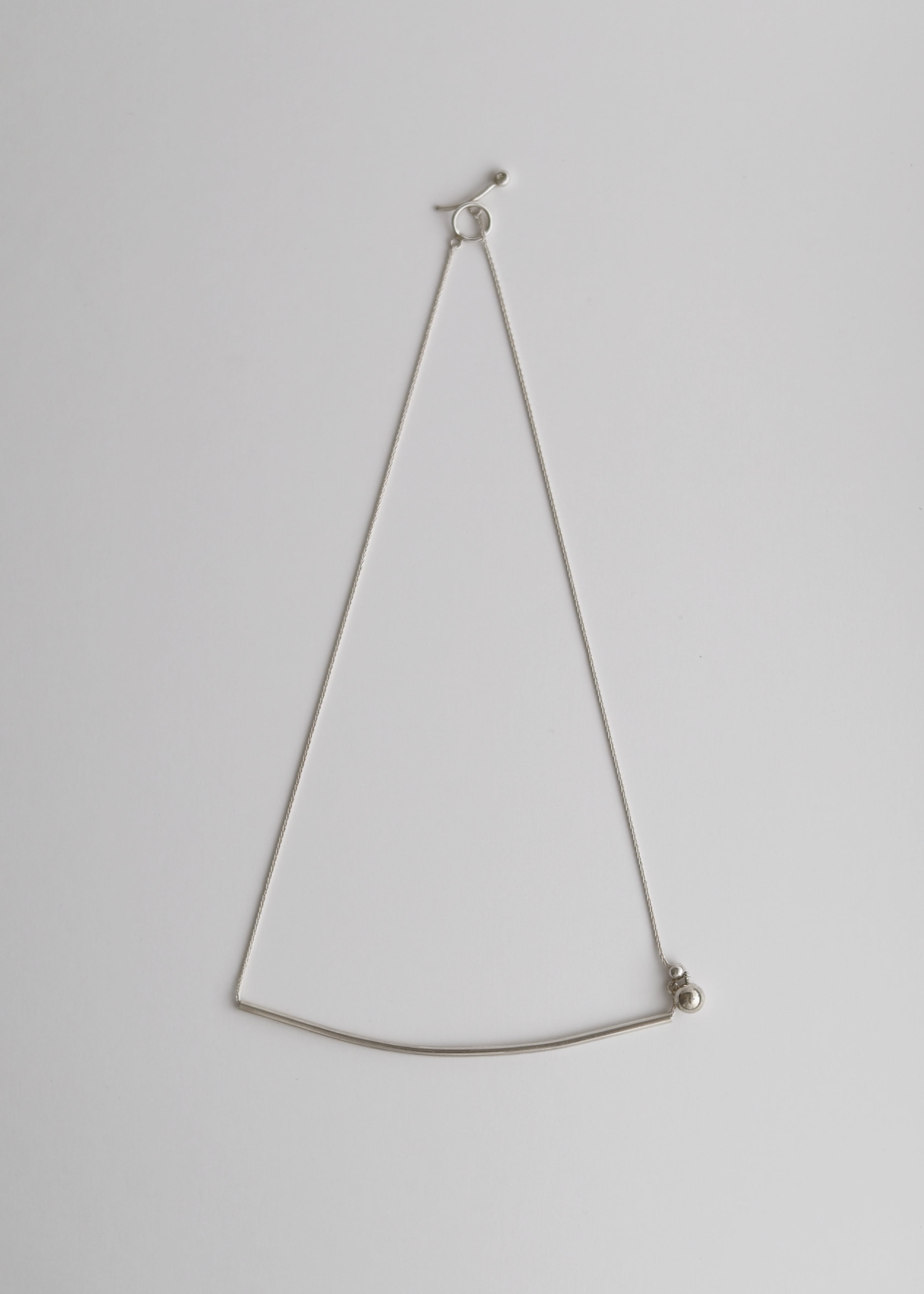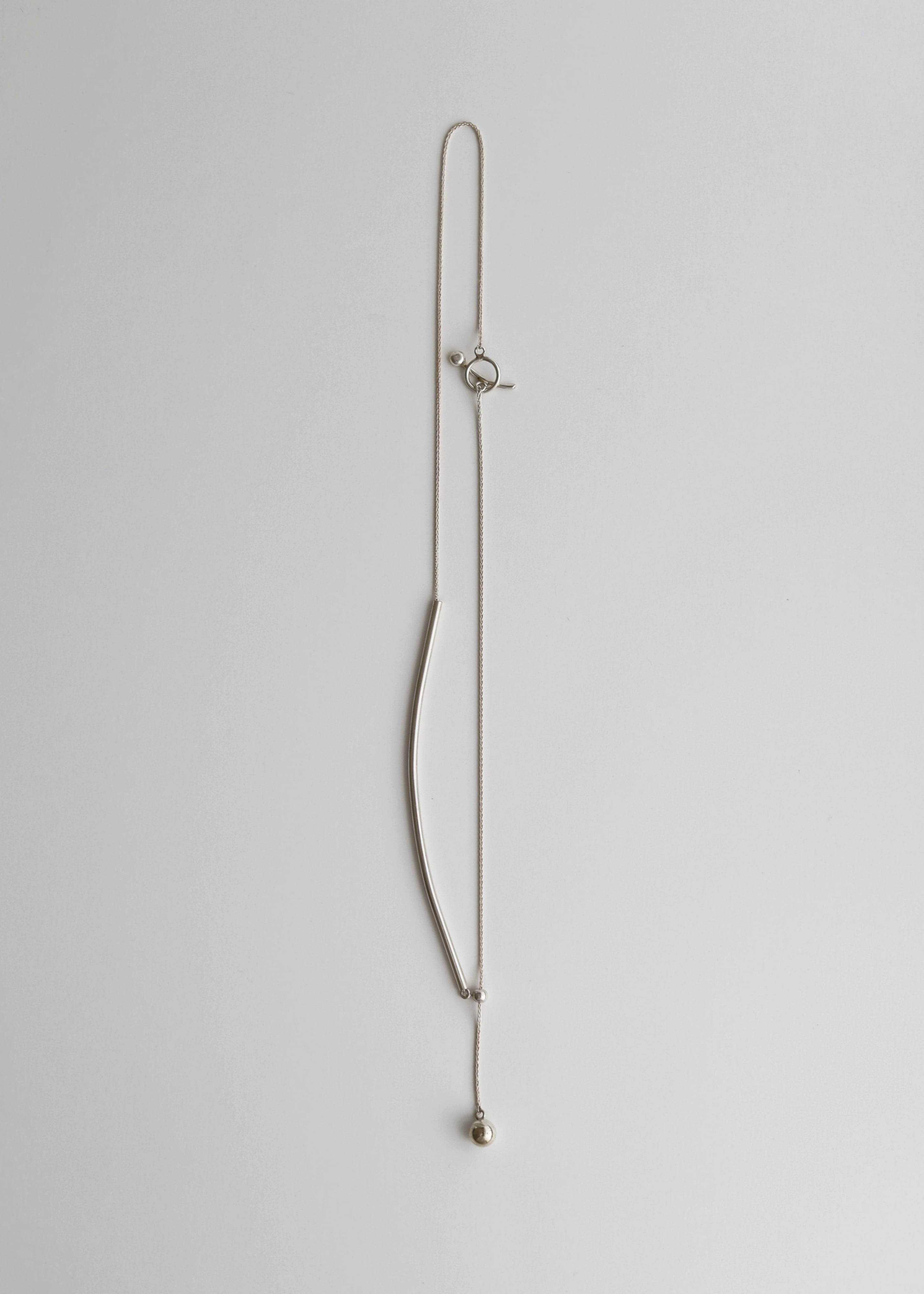 314で一番最初に生まれたネックレス。シンプルな仕立てに、シルバーのバーがさりげなく主張。シリコン入りのスライドボールを使用し、ネックレスをくるくると回すことで、様々なコーディネートが楽しめます。