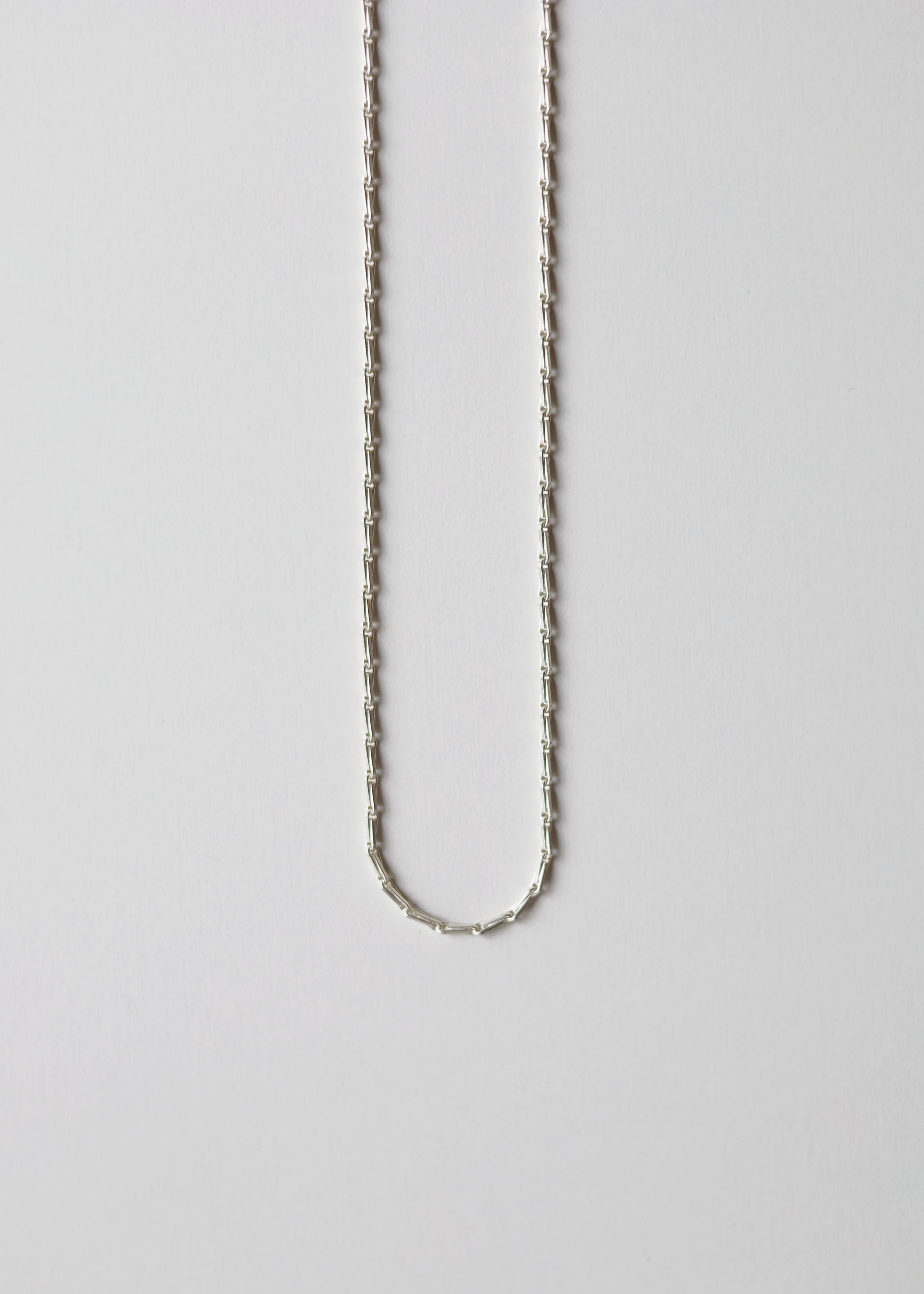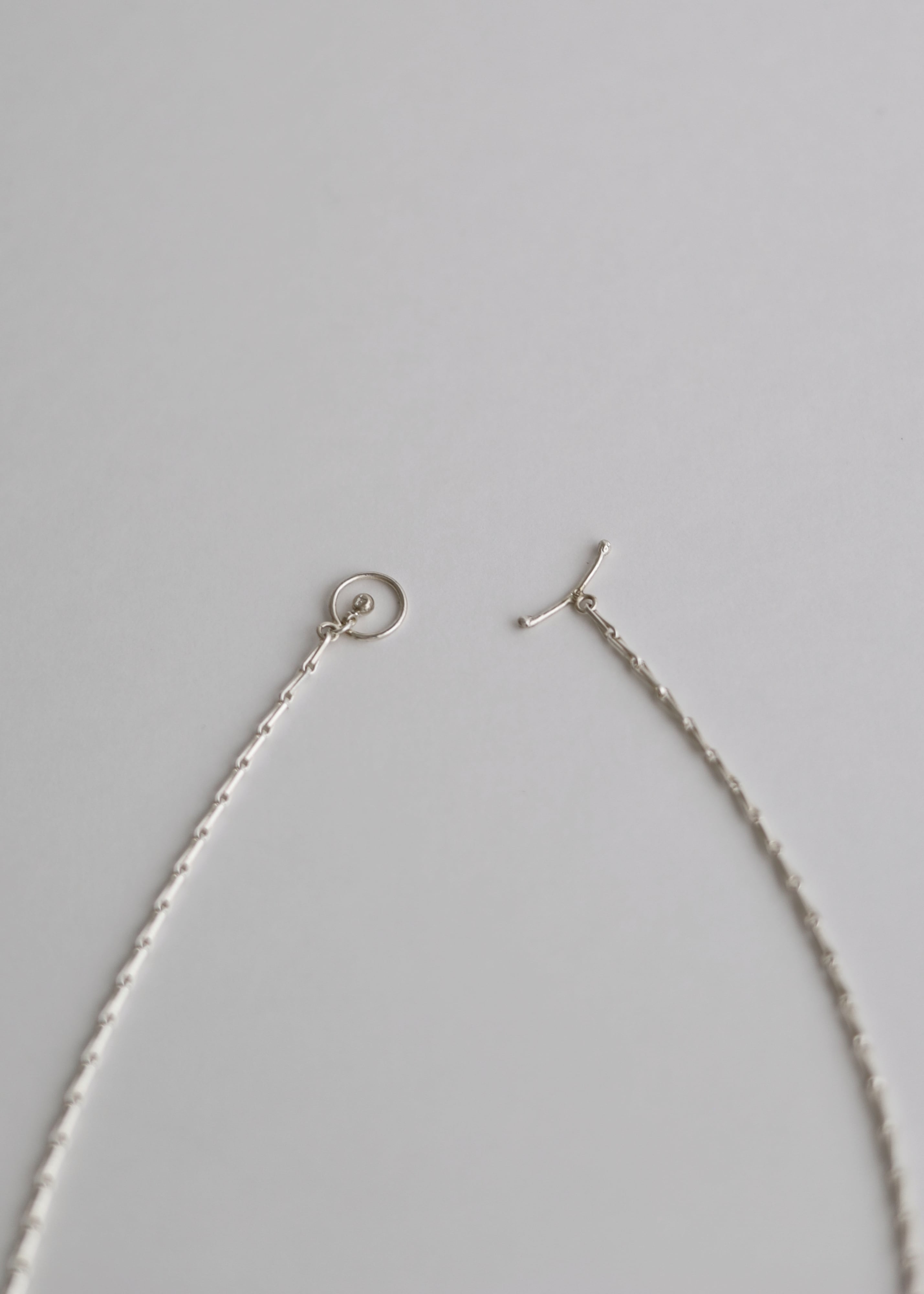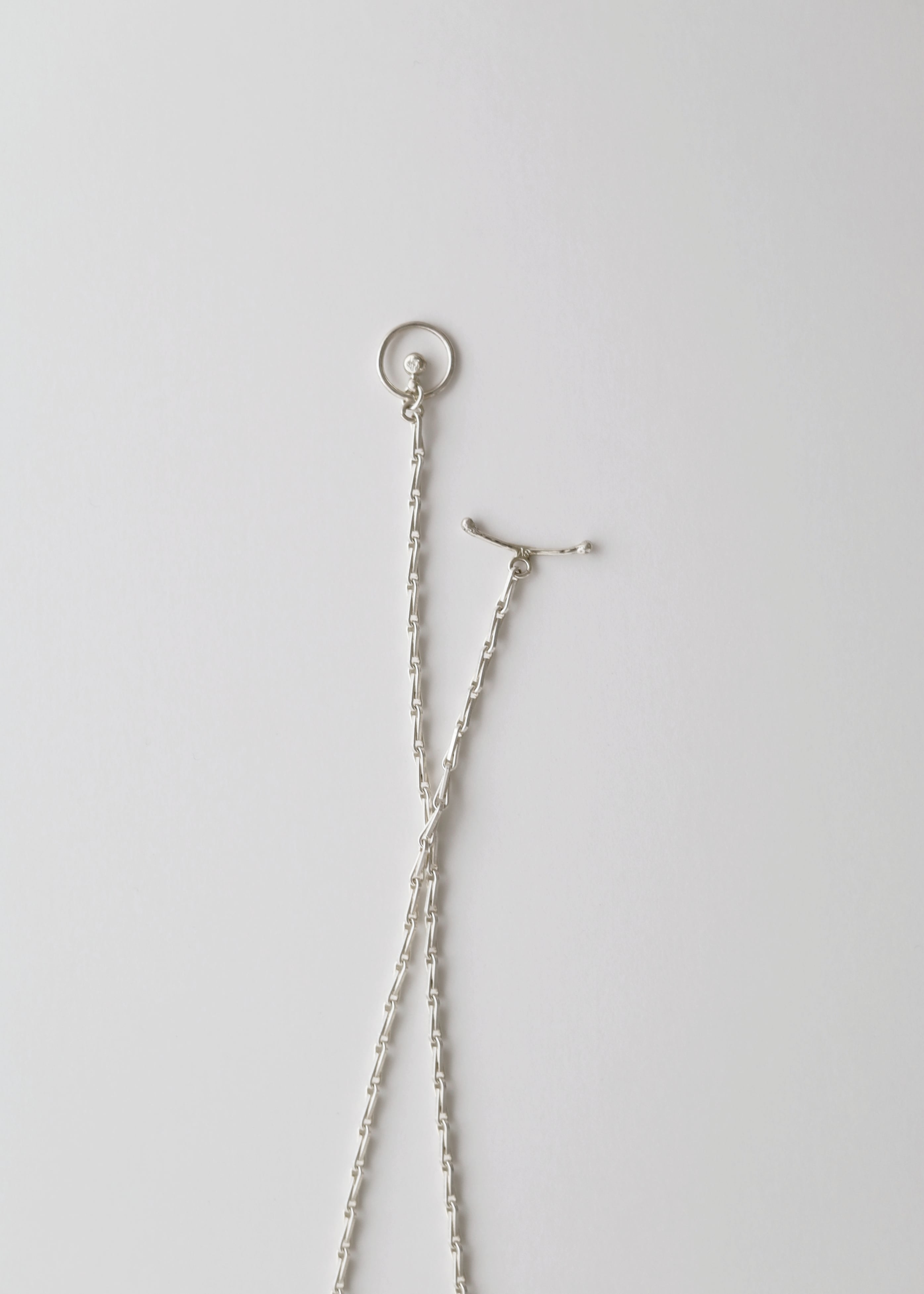 314のコンセプトに沿った、いつの時代のスタイリングにも馴染むデザインチェーンで制作。金具は一つずつ制作し、バーを通すだけで着用可能。
