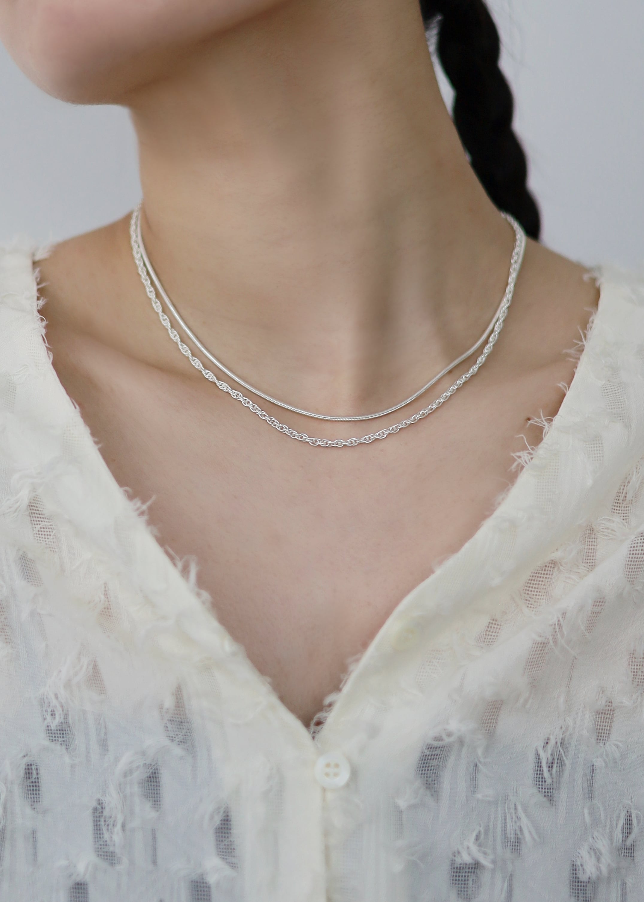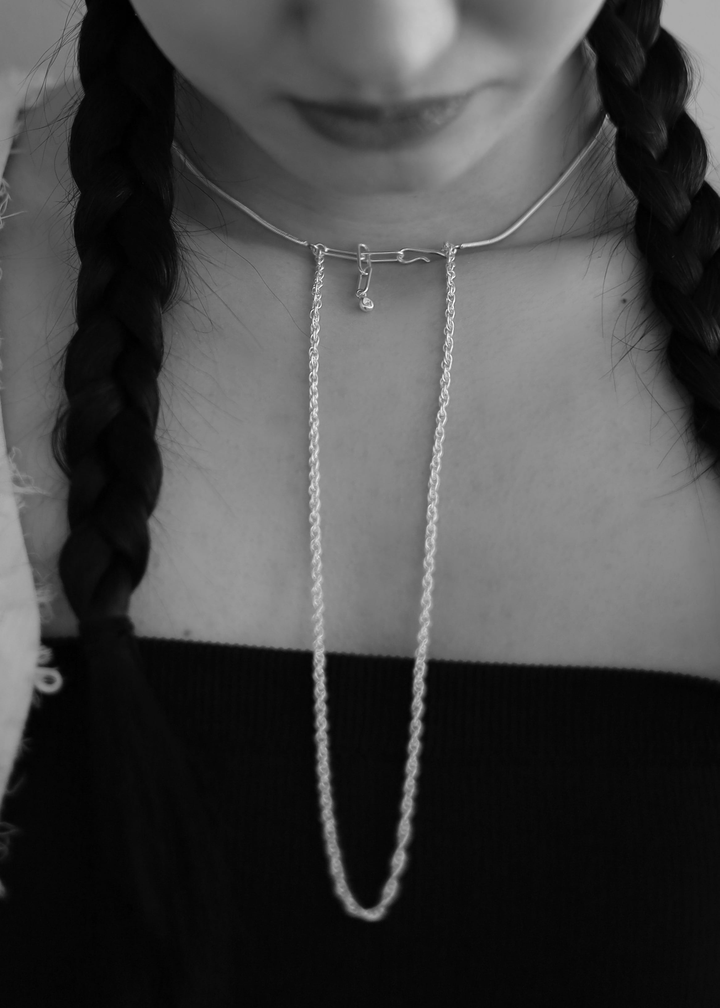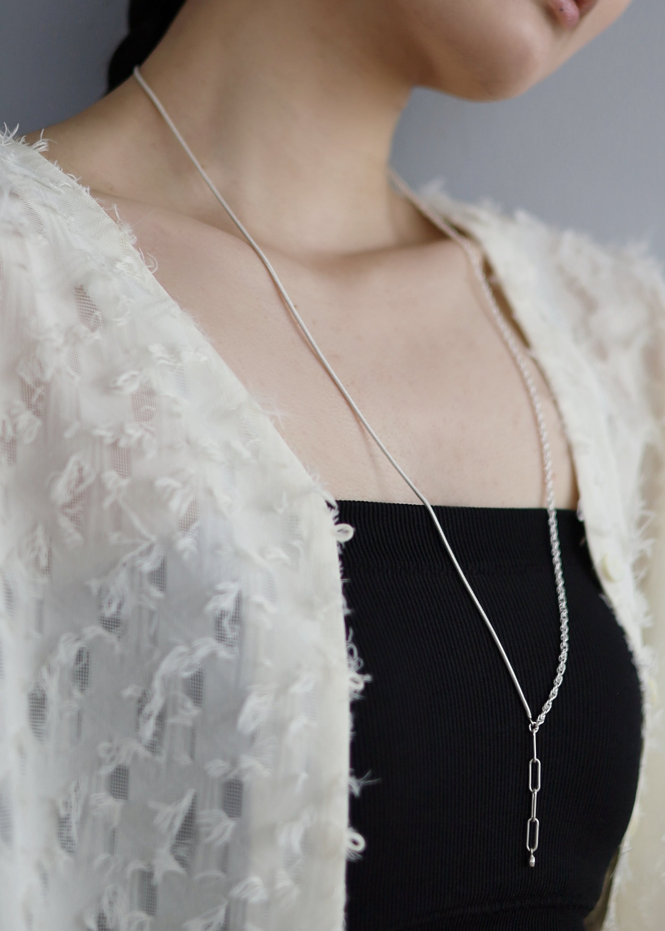 重厚感のあるチェーンを2本組み合わせたネックレス。存在感のある約37cmのチョーカー、約40cmのネックレス、約72cmのロングネックレスになる、3way仕様。