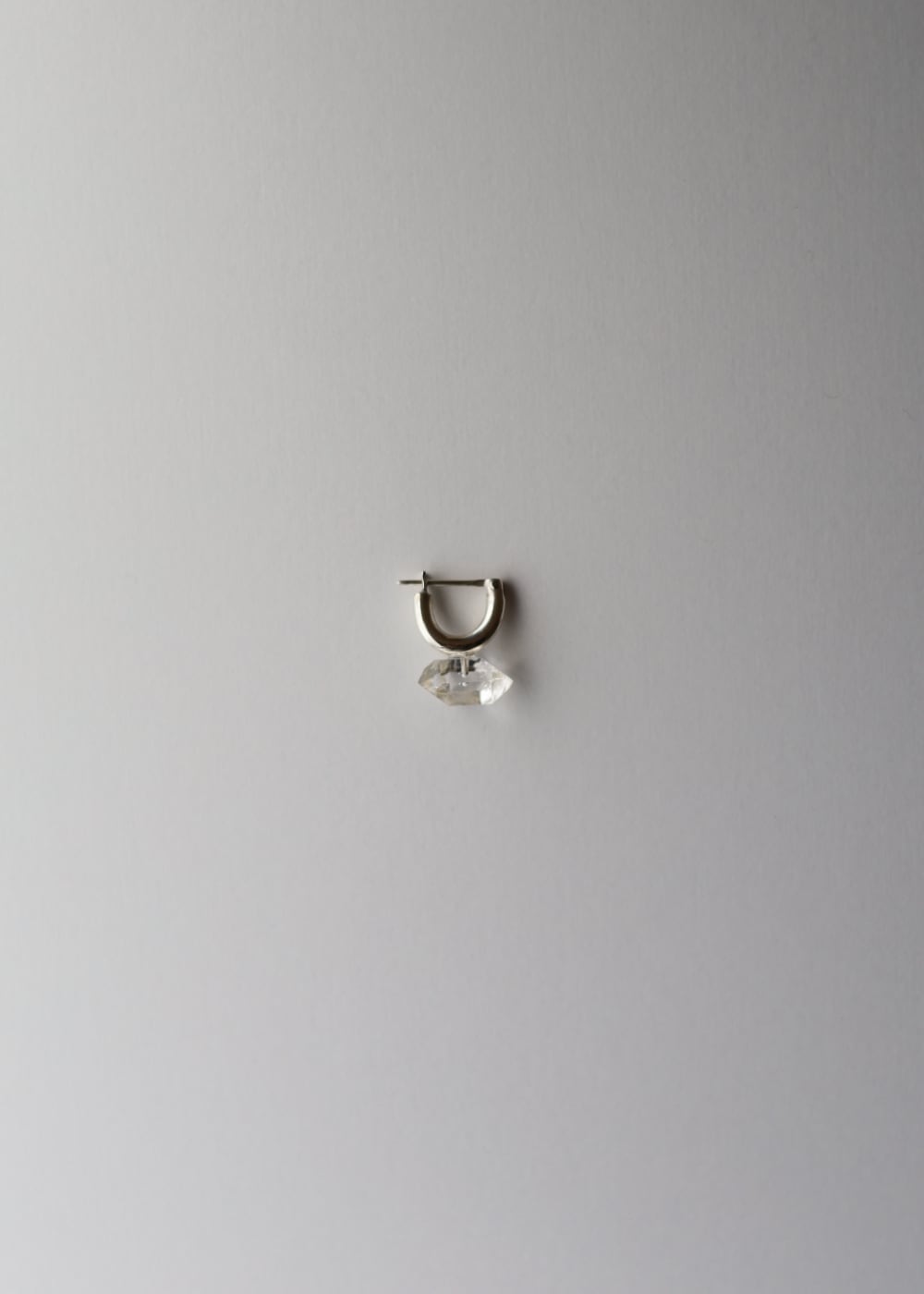 ハーキマーダイヤモンドを留めた小さな片耳ピアス。耳たぶの下に石がきらっと光ります。