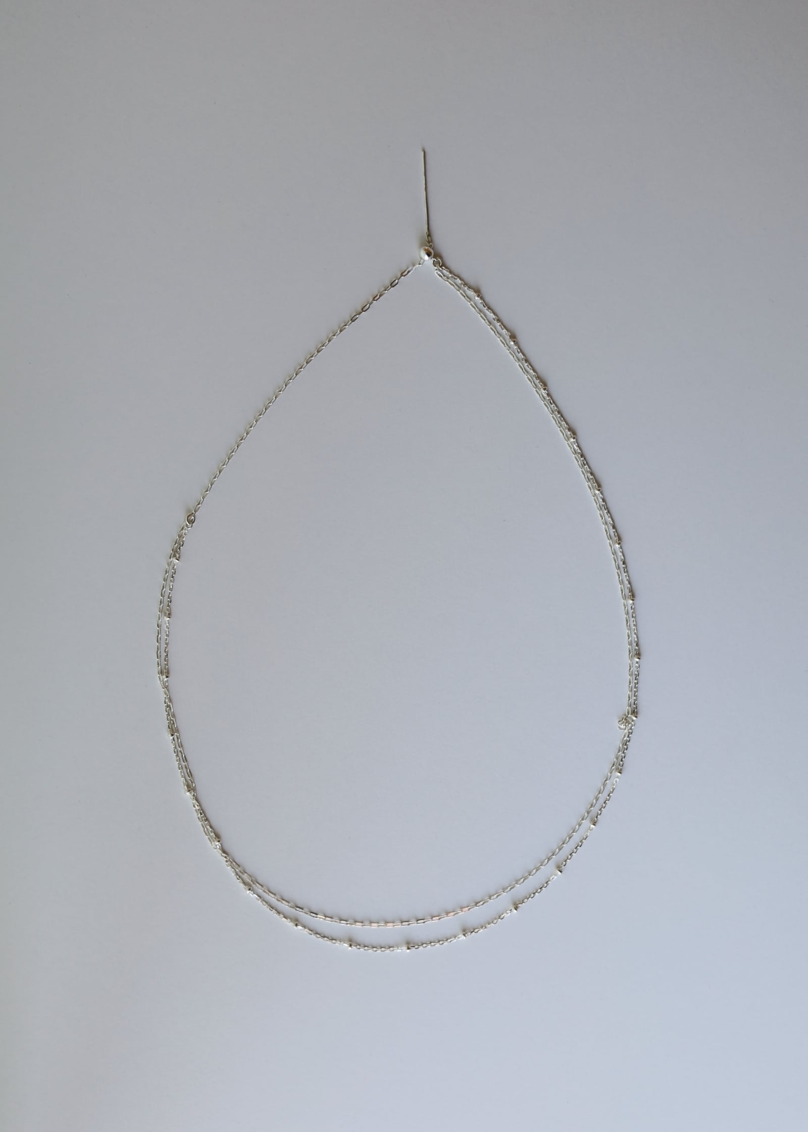 星を繋げたようなチェーンと、きらりと光るチェーンを重ねたネックレス。シリコンボールへチェーンを通して着脱、長さ調整が可能です。チェーンを広げて被って着用したり、金具を胸の前で留めることで、Y字ネックレスにもなります。