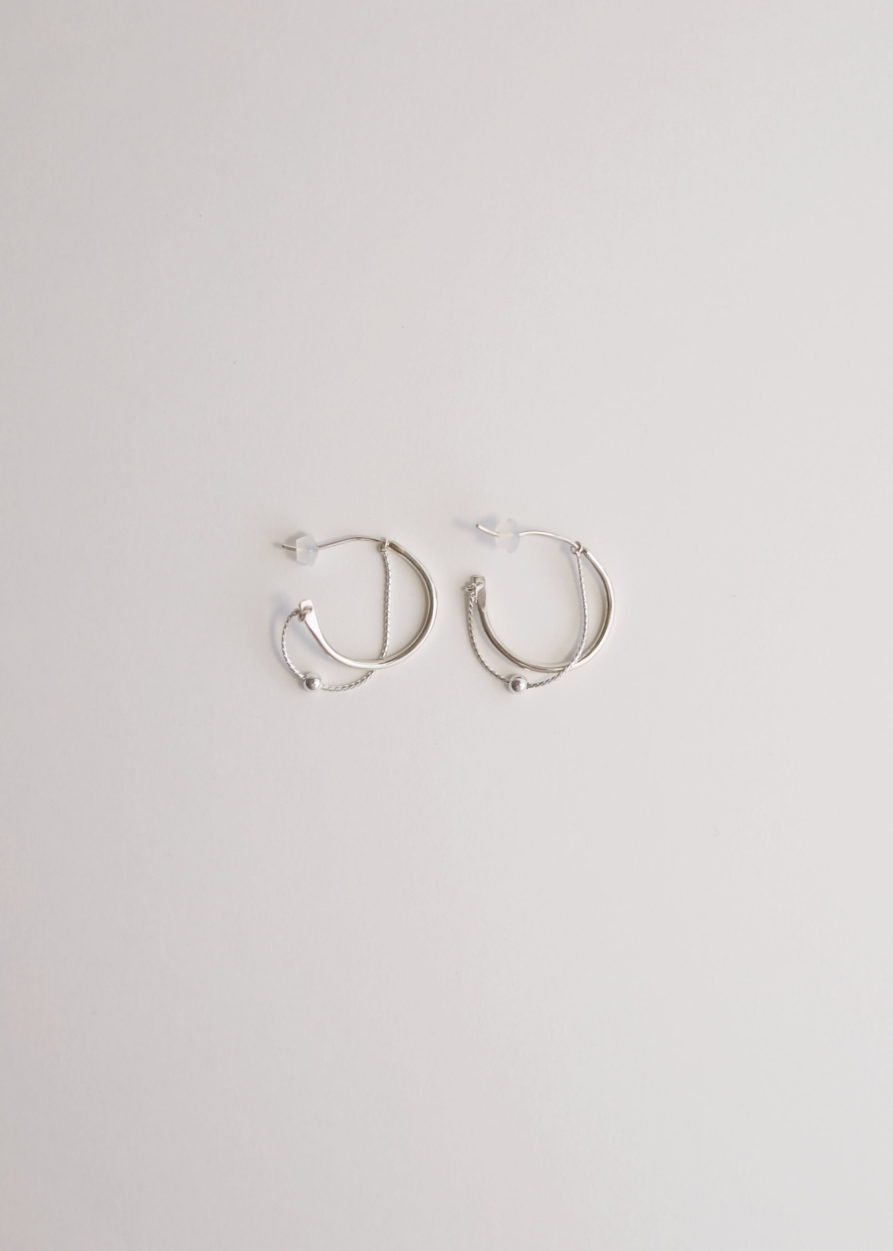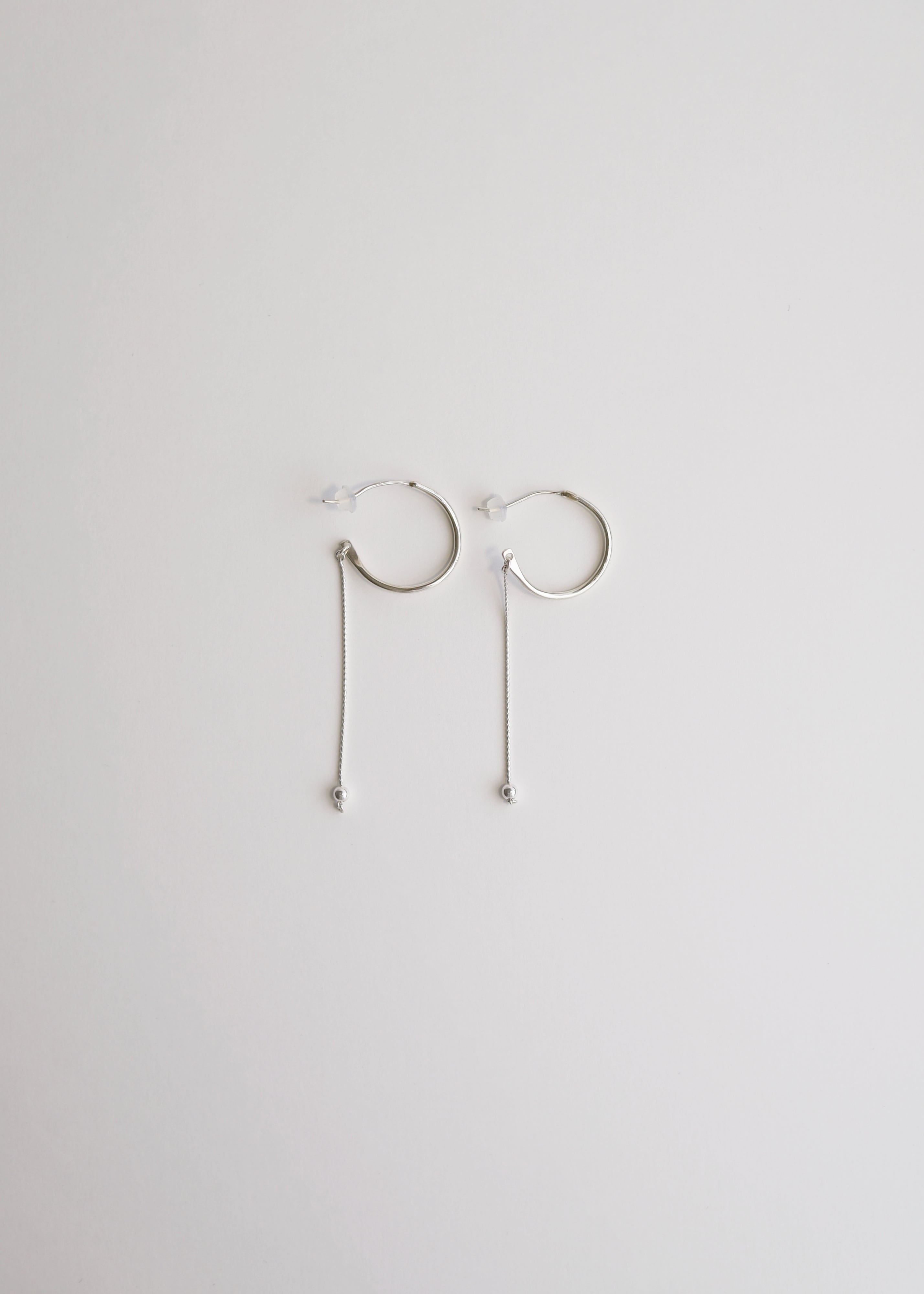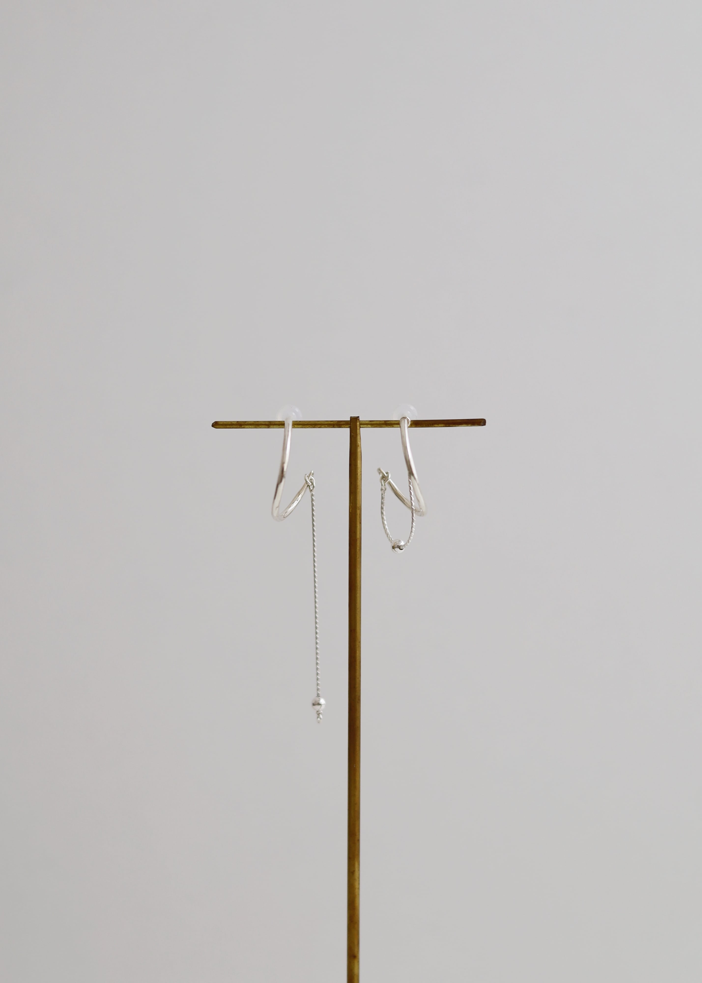 捻れた線の下に、小さな月のようなボールが揺れるの繊細なピアス。丸い玉の下についている丸カンをポストに通すことで、ショートデザインに変化。シリコンキャッチが付属します。